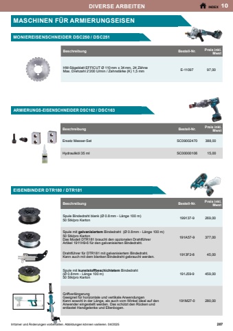 3 43BOHRENINDEXIrrt%u00fcmer und %u00c4nderungen vorbehalten. Abbildungen k%u00f6nnen variieren.Irrt%u00fcmer und %u00c4nderungen vorbehalten. Abbildungen k%u00f6nnen variieren. 04/2025.HOLZBOHRERSPIRALBOHRER MIT RUNDSCHAFTSpiralbohrer mit Zentrierspitze und 2 Schulterschneiden f%u00fcr exakte und splitterfreie Bohrungen in Hart- und Weichholz.Bohrer %u00d8 (mm)Gesamtl%u00e4nge (mm)Bestell-Nr.Preis inkl. Mwst3,060D-070262,004,075D-070322,005,085D-070482,006,095D-070542,007,0110D-070602,008,0115D-070763,009,0125D-070823,00Bohrer %u00d8 (mm)Gesamtl%u00e4nge (mm)Bestell-Nr.Preis inkl. Mwst10,0135D-070983,0012,0155D-071073,0014,0170D-071134,0016,0180D-071294,0018,0200D-071357,0020,0200D-071418,00SPIRALBOHRER MIT RUNDSCHAFT IM 5ER ODER 10ER PACKBohrer %u00d8 (mm)Gesamtl%u00e4nge (mm)MengeBestell-Nr.Preis inkl. Mwst36110D-7172215,0047510D-7173815,0058610D-7174415,0069310D-7175015,00811710D-7176621,00101335D-717729,00FORSTNERBOHRER MIT RUNDEM SCHAFTBohr %u00d8 (mm)Bestell-Nr.Preis inkl. Mwst10D-418449,0015D-4192511,0020D-4223213,0025D-4224814,0026D-42254 15,00Standard Holzbohrkronen, geeignet zum Bohren von Sackl%u00f6chern oder Durchgangsl%u00f6chern von mittlerem Durchmesser. Gesamtl%u00e4nge 90 mm.Bohr %u00d8 (mm)Bestell-Nr.Preis inkl. Mwst30D-4226016,0032D-4227616,0035D-4228217,0040D-4229821,0050D-4230730,00Je 1x : 15 mm / 20 mm / 25 mm / 30 mm / 35 mmInhaltBestell-Nr.Preis inkl. MwstD-4736355,00FORSTNERBOHRER MIT RUNDEM SCHAFT