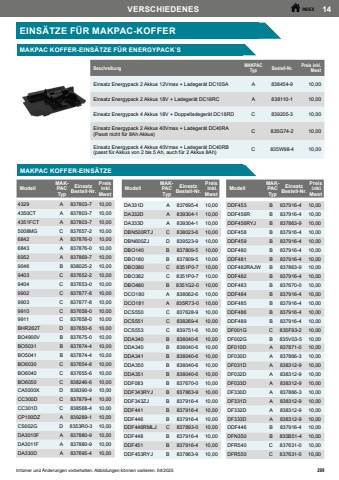 467H%u00c4MMERINDEXIrrt%u00fcmer und %u00c4nderungen vorbehalten. Abbildungen k%u00f6nnen variieren. 04/2025MEISSELTypBeschreibungBreite x L%u00e4nge(mm)Bestell-Nr.Preis inkl. MwstSpitzmeisselF%u00fcr allgemeine Meissel- und Aufbrucharbeiten von Mauerwerk, Beton und losem Gestein250P-2506814,00Spitzmeisselselbstsch%u00e4rfend250B-64761*17,00Flachmeissel20 x 200P-2507415,00Flachmeisselselbstsch%u00e4rfend20 x 250B-64777*18,00BreitmeisselF%u00fcr universelles Abtragen von Materialien gr%u00f6sseren Umfangs37 x 200A-3048322,00Breitmeissel selbstsch%u00e4rfend40 x 250B-14059*26,00Breitmeisselselbstsch%u00e4rfend60 x 250B-14065*32,00Breitmeissel80 x 150D-6104222,00Breitmeissel80 x 250D-6102030,00HohlmeisselZum Stemmen von schmalen Kan%u00e4len in Mauerwerk22 x 240P-2508030,00FliesenmeisselGekr%u00f6pfter und flacher Meissel.Zum Abschlagen von Fliesen geeignet.Die flache Schneide minimiert das Brechen von Fliesen40 x 260P-6398726,00Fliesenmeissel selbstsch%u00e4rfend40 x 260B-14071**30,00Schaber komplett100 x 160A-68161146,00ErsatzSchaberblech343411-946,00* 30% h%u00f6here Abtragsleistung, aufgrund der selbstsch%u00e4rfenden Eigenschaft in Verbindung mit der neuartigen Form (kein extra Nachsch%u00e4rfen notwendig). Deutlich l%u00e4ngere Lebensdauer.** 40% h%u00f6here Abtragsleistung. Geeignet f%u00fcr schmale Fugen zwischen Fliesen, dank flachem Spaten.Weniger Fliesenbruch aufgrund seiner speziellen Form.SDS-PLUS
