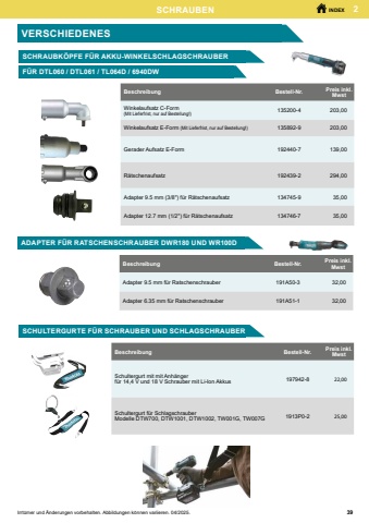 223INDEXIrrt%u00fcmer und %u00c4nderungen vorbehalten. Abbildungen k%u00f6nnen variieren. 04/2025. SCHRAUBENIMPACT PREMIER - VERSCHIEDENESBITHALTER MIT MAGNETBeschreibungL%u00e4nge mmBestell-NrPreis inkl. MwstTorsion magnetisch66E-0339911,00Torsion magnetisch150E-0340814,00Ultra Magmit extra starkem Magnet80E-2027014,00MAGNET MAG BOOST TORSIONBeschreibungL%u00e4nge mmBestell-NrPreis inkl. MwstMag Boost TorsionExtra starker MagnetErleichtert das schnelle Ansetzen der SchraubeMehrzweckgebrauch50E-034426,00STECKSCHL%u00dcSSEL 6-KANT 1/4%u201c MIT MAGNETBeschreibungGr%u00f6sse (SW)L%u00e4nge mmBestell-NrPreis inkl. MwstMit starkem MagnetLeicht zu s%u00e4ubern665E-034586,00865E-034648,001065E-034709,001365E-0348610,00WINKEL-ADAPTER 50 MMBeschreibungBestell-NrPreis inkl. MwstAdapter 1/4%u2033 Sechskantaufnahme > 1/2%u2033 VierkantaufnahmeE-0343612,00Adapter 1/4%u2033 Sechskantaufnahme > 3/8%u2033 VierkantaufnahmeE-0342012,00Der Adapter kann bis zu 15%u00b0 geneigt werden. F%u00fcr Verschraubungen in Ecken und an schwer zug%u00e4nglichen Stellen.GELENK STECKSCHL%u00dcSSEL 6-KANT 17 MM - 80 MMBeschreibungBestell-NrPreis inkl. MwstGelenk Steckschl%u00fcssel 6-Kant 17 mm - 80 mmErlaubt eine Neigung von 15%u00b0 und eignet sich so f%u00fcr Arbeiten auf engstem RaumE-0351715,00