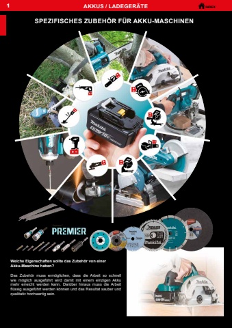 1 4AKKUS / LADEGER%u00c4TEINDEXPreise sind unverbindlich empfohlene VK-Preise.SPEZIFISCHES ZUBEH%u00d6R F%u00dcR AKKU-MASCHINENWelche Eigenschaften sollte das Zubeh%u00f6r von einer Akku-Maschine haben?Das Zubeh%u00f6r muss erm%u00f6glichen, dass die Arbeit so schnell wie m%u00f6glich ausgef%u00fchrt wird damit mit einem einzigen Akku mehr erreicht werden kann. Dar%u00fcber hinaus muss die Arbeit fl%u00fcssig ausgef%u00fchrt werden k%u00f6nnen und das Resultat sauber und qualitativ hochwertig sein.