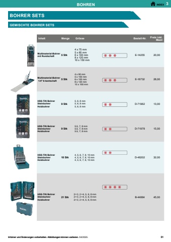 INDEX3Heissluftgebl%u00e4se211Blasger%u00e4te213 11 - Lampen / Laser2141Akku-Radios mit Laterne219Laser Messger%u00e4te221Stative223 12 - Cleaning224 Schema f%u00fcr Anschl%u00fcsse225Absaugstutzen 226Absaugsysteme f%u00fcr H%u00e4mmer228Absaugschl%u00e4uche %u00d8 28/32 mm231Absaugschl%u00e4uche %u00d8 28 mm234Absaugschlauch %u00d8 38 mm235Absaugschl%u00e4uche %u00d8 32 mm236Absaugschl%u00e4uche %u00d8 36 und 27 mm237Absaugschl%u00e4uche %u00d8 27, 32, 36 mm238Profi-Sets240Multi-Marken Adapter241Akku-Staubsauger - spezifisch242Filter und Staubs%u00e4cke246Zyklon f%u00fcr Hand-Staubsauger250Akku Hand-Staubsauger251AWS System253Kehrsaugmaschine VS001G254Scheuermaschine PS001G255 13 - Outdoor256 Kettens%u00e4gen258%u00d6l und Fett262Heckenscheren263Akku-Rebscheren265Akku- Hecken- und Grasscheren266Motorsensen267Combi-Express272Blasger%u00e4te278Hochdruckreiniger280Akku-Druckreiniger DHW180282Spr%u00fchger%u00e4te283Rasenm%u00e4her284M%u00e4hroboter286Vertikutierer286Akku-Schubkarren287Erdbohrer288Trennschleifer290 14 - Verschiedenes291 Arbeitsausr%u00fcstung 292Werkzeugtaschen294Arbeit und Freizeit295Makpac - Das Koffersystem296Transportkoffer 302Kohleb%u00fcrsten304Wissenswertes307 1 - Akkus / Ladeger%u00e4te4 2 - Schrauben 19 3 - Bohren41 4 - H%u00e4mmer63 5 - S%u00e4gen 88 6 - Hobeln / Schleifen 124 7 - Fr%u00e4sen / Multitool 145 8 - Metallbearbeitung 169 9 - Diamant 193 10 - Diverse Arbeiten202 11 - Lampen / Laser214 12 - Cleaning 224 13 - Outdoor 256 14 - Verschiedenes 291