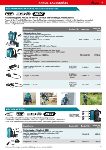 1 7>>>>AKKUS / LADEGER%u00c4TEINDEXIrrt%u00fcmer und %u00c4nderungen vorbehalten. Abbildungen k%u00f6nnen variieren. 04/2025.R%u00dcCKENTRAGBARE AKKUS PDC1200 UND PDC1500R%u00fcckentragbare Akkus f%u00fcr Profis und f%u00fcr extrem lange Arbeitszeiten. Passen f%u00fcr 2x18V und 40V Maschinen. Auch f%u00fcr Maschinen mit Verbindungsstecker. Nicht mit 1x18V Maschinen kompatibel.IPX4 : Geeignet f%u00fcr alle Wetterbedingungen und gesch%u00fctzt gegen allf%u00e4lliges Spritzwasser. Darf nicht eingetaucht werden..Inklusiv Ladeger%u00e4t DC4001.BezeichnungGeeignet f%u00fcrBestell-Nr.Preis inkl. MwstR%u00fcckentragbarer AkkuF%u00fcr Maschinen mit Verbindungsstecker Auch f%u00fcr 2x18V oder 40Vmax Maschinen mit opzionalen Adapter (siehe unten)Leistungsst%u00e4rke 43.55 Ah / 1%u2018568 Wh130 ZellenLadezeit 7,5 StundenGewicht 13 kgGeliefert mit Ladeger%u00e4t DC4001, ohne AdapterPDC1500A012%u2018339,00R%u00fcckentragbarer AkkuF%u00fcr Maschinen mit Verbindungsstecker oder 2x18VAuch f%u00fcr 40Vmax Maschinen mit opzionalem XGT Adapter (siehe unten)Leistungsst%u00e4rke 33.5 Ah / 1%u2018206 Wh100 ZellenLadezeit 6 StundenGewicht 8.8 kgGeliefert mit Ladeger%u00e4t DC4001 und Adapter 191J51-5 (2x18V)PDC1200A011%u2018775,00Ersatz-Ladeger%u00e4t DC4001 f%u00fcr r%u00fcckentragbare Akkus230V / 350 WPDC1500PDC1200191L00-4290,00Adapter XGT 40VmaxPDC1500PDC1200PDC01191N62-4249,00Adapter LXT 2x18VPDC1500PDC1200PDC01191J51-5215,00AKKU-BANK PDC01Bis vier 18V-Akkus k%u00f6nnen bequem auf dem R%u00fccken getragt werden.Geliefert mit 2 Adapter. Adapter f%u00fcr 1x18V und Adapter f%u00fcr 2x18V=36V. Ohne Akkus.Kann auch mit Adapter 40Vmax (im Sonderzubeh%u00f6r, siehe oben) gebraucht werden.BezeichnungGeeignet f%u00fcrBestell-Nr.Preis inkl. MwstR%u00fcckentragbare Akku-Bank DC01F%u00fcr Maschinen mit Verbindungsstecker, 18V und 2x18VAuch f%u00fcr Maschinen 40Vmax mit opzionalem XGTAdapter (siehe oben)Gewicht 2.8 kg ohne AkkusGeliefert mit Adapter 1x18V und 2x18V (siehe oben)191A59-5860,00Adapter LXT 1x18VPDC01191J50-7180,00Die Akkus sind nicht im Liefer-umfang enthalten