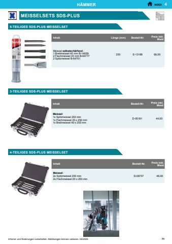 223INDEXIrrt%u00fcmer und %u00c4nderungen vorbehalten. Abbildungen k%u00f6nnen variieren. 04/2025. SCHRAUBENIMPACT PREMIER - VERSCHIEDENESBITHALTER MIT MAGNETBeschreibungL%u00e4nge mmBestell-NrPreis inkl. MwstTorsion magnetisch66E-0339911,00Torsion magnetisch150E-0340814,00Ultra Magmit extra starkem Magnet80E-2027014,00MAGNET MAG BOOST TORSIONBeschreibungL%u00e4nge mmBestell-NrPreis inkl. MwstMag Boost TorsionExtra starker MagnetErleichtert das schnelle Ansetzen der SchraubeMehrzweckgebrauch50E-034426,00STECKSCHL%u00dcSSEL 6-KANT 1/4%u201c MIT MAGNETBeschreibungGr%u00f6sse (SW)L%u00e4nge mmBestell-NrPreis inkl. MwstMit starkem MagnetLeicht zu s%u00e4ubern665E-034586,00865E-034648,001065E-034709,001365E-0348610,00WINKEL-ADAPTER 50 MMBeschreibungBestell-NrPreis inkl. MwstAdapter 1/4%u2033 Sechskantaufnahme > 1/2%u2033 VierkantaufnahmeE-0343612,00Adapter 1/4%u2033 Sechskantaufnahme > 3/8%u2033 VierkantaufnahmeE-0342012,00Der Adapter kann bis zu 15%u00b0 geneigt werden. F%u00fcr Verschraubungen in Ecken und an schwer zug%u00e4nglichen Stellen.GELENK STECKSCHL%u00dcSSEL 6-KANT 17 MM - 80 MMBeschreibungBestell-NrPreis inkl. MwstGelenk Steckschl%u00fcssel 6-Kant 17 mm - 80 mmErlaubt eine Neigung von 15%u00b0 und eignet sich so f%u00fcr Arbeiten auf engstem RaumE-0351715,00