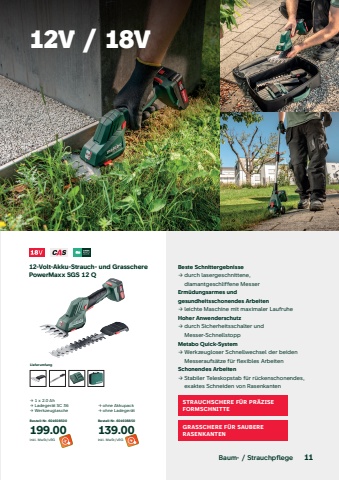 12V / 18V%u21921 x 2.0 Ah%u2192Ladeger%u00e4t SC 36%u2192WerkzeugtascheBestell-Nr. 601608500199.00inkl. MwSt/vRG12-Volt-Akku-Strauch- und GrasscherePowerMaxx SGS 12 Q%u2192ohne Akkupack%u2192ohne Ladeger%u00e4tBestell-Nr. 601608850139.00inkl. MwSt/vRGLieferumfangBeste Schnittergebnisse%u2192durch lasergeschnittene, diamantgeschliffene MesserErm%u00fcdungsarmes und gesundheitsschonendes Arbeiten%u2192leichte Maschine mit maximaler LaufruheHoher Anwenderschutz%u2192durch Sicherheitsschalter und Messer-SchnellstoppMetabo Quick-System%u2192Werkzeugloser Schnellwechsel der beiden Messeraufs%u00e4tze f%u00fcr flexibles ArbeitenSchonendes Arbeiten%u2192Stabiler Teleskopstab f%u00fcr r%u00fcckenschonendes, exaktes Schneiden von RasenkantenGRASSCHERE F%u00dcR SAUBERERASENKANTENSTRAUCHSCHERE F%u00dcR PR%u00c4ZISEFORMSCHNITTEBaum- / Strauchpflege11