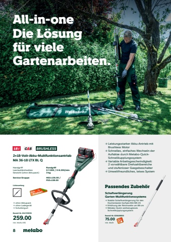 All-in-oneDie L%u00f6sung f%u00fcr viele Gartenarbeiten.2x18-Volt-Akku-MultifunktionsantriebMA 36-18 LTX BL QHandgriffRundgriffLeerlaufdrehzahlen0-7.000 / 0-8.200/minGewicht (ohne Akkupack)3 kgService GruppeH02=135.00 /FS3=159.00Lieferumfang%u2192ohne Akkupack%u2192ohne Ladeger%u00e4t%u2192SchultergurtBestell-Nr. 601725850259.00inkl. MwSt/vRG%u2192Stabile Schaftverl%u00e4ngerung f%u00fcr den Hochentaster-Aufsatz MA-MS 25 %u2192Erh%u00f6hung der Reichweite um 88 cm%u2192Metabo Quick werkzeugloses SchnellkupplungssystemBestell-Nr. 628498000 75.00inkl. MwStPassendes Zubeh%u00f6rSchaftverl%u00e4ngerung Garten-Multifunktionssystems%u2192Leistungsstarker Akku-Antrieb mit Brushless Motor%u2192Schnelles, einfaches Wechseln der Aufs%u00e4tze durch Metabo-QuickSchnellkupplungssystem%u2192Variable Arbeitsgeschwindigkeit: 2 vorw%u00e4hlbare Drehzahlbereiche und stufenloser Gasgebeschalter%u2192Umweltfreundliches, leises System8