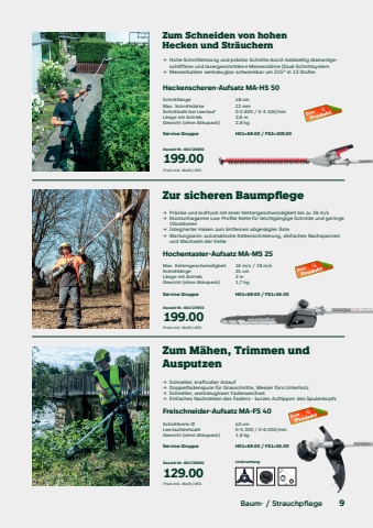Baum- / StrauchpflegeZum Schneiden von hohen Hecken und Str%u00e4uchernZursicherenBaumpflegeZum M%u00e4hen, Trimmen und Ausputzen%u2192Hohe Schnittleistung und pr%u00e4zise Schnitte durch beidseitig diamantgeschliffene und lasergeschnittene Messerz%u00e4hne (Dual-Schnittsystem%u2192Messerbalken werkzeuglos schwenkbar um 215%u00b0 in 13 Stufen%u2192Pr%u00e4zise und kraftvoll mit einer Kettengeschwindigkeit bis zu 18 m/s %u2192R%u00fcckschlagarme Low Profile Kette f%u00fcr leichtg%u00e4ngige Schnitte und geringe Vibrationen %u2192Integrierter Haken zum Entfernen abges%u00e4gter %u00c4ste %u2192Wartungsarm: automatische Kettenschmierung, einfaches Nachspannen und Wechseln der Kette%u2192Schneller, kraftvoller Anlauf%u2192Doppelfadenspule f%u00fcr Grasschnitte, Messer f%u00fcrs Unterholz%u2192Schneller, werkzeugloser Fadenwechsel%u2192Einfaches Nachstellen des Fadens - kurzes Auftippen des SpulenkopfsHeckenscheren-Aufsatz MA-HS 50 Schnittl%u00e4nge 48 cmMax. Schnittst%u00e4rke22 mmSchnittzahl bei Leerlauf 0-2.600 / 0-3.100/minL%u00e4nge mit Antrieb2,6 mGewicht (ohne Akkupack)2,8 kg Service GruppeH01=69.00 / FS2=109.00Bestell-Nr. 601726850 199.00Preis inkl. MwSt/vRGLieferumfangHochentaster-Aufsatz MA-MS 25 Max. Kettengeschwindigkeit 16 m/s / 18 m/sSchnittl%u00e4nge24 cmL%u00e4nge mit Antrieb2 mGewicht (ohne Akkupack)1,7 kg Service GruppeH01=69.00 / FS1=55.00Bestell-Nr. 601727850 199.00Preis inkl. MwSt/vRGFreischneider-Aufsatz MA-FS 40Schnittkreis-%u00d8 40 cmLeerlaufdrehzahl0-5.300 / 0-6.000/minGewicht (ohne Akkupack)1,6 kg Service GruppeH01=69.00 / FS1=55.00Bestell-Nr. 601728850 129.00Preis inkl. MwSt/vRG9