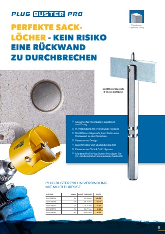 bis 100mm S%u00e4getiefe%u00d8 56mm bis 82mmPERFEKTE SACKL%u00d6CHER -KEIN RISIKO EINE R%u00dcCKWAND ZU DURCHBRECHENART. NR.%u00d8MMMULTI PURPOSEPREISDDH2PBP565656%u201358mm40.00DDH2PBP686868%u201370mm40.70DDH2PBP737373-75 mm41.00DDH2PBP767676-77 mm41.20DDH2PBP828282-84 mm41.50PLUG BUSTER PRO IN VERBINDUNG MIT MULTI PURPOSEPorenbeton, Gipsblock, YtongGeeignet f%u00fcr Porenbeton, Gipsblock und YtongIn Verbindung mit ProFit Multi PurposeBis 100 mm S%u00e4getiefe, kein Risiko eine R%u00fcckwand zu durchbrechenPatentiertes DesignDurchmesser von 56 mm bis 82 mmPatentiertes Click & Drill%u00ae-SystemMit dem ProFit Plug Buster Pro s%u00e4gen Sie im Handumdrehen ein sauberes Sackloch11