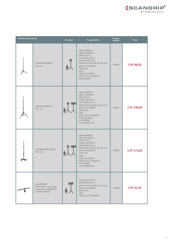 VEGA 2 CONNECT VEGA 4 CONNECTProduct number03.6106C03.6104CLight source60 LEDs105 LEDsLED performance, lumen/W189189Luminous flux, lumen1000 / 2000 (step 1 /2)2000 / 4000 (step 1 / 2)Iluminance, lux@0.5 m1500 / 3000 (step 1 / 2)3000 / 6000 (step 1 / 2)Adjustable light output2 levels2 levelsBeam angle100%u00b0100%u00b0CRIRa > 80Ra > 80CCT6000 K6000 KOperating time with max. lumen, h4.5@18 V 5.2 Ah battery2.25@18 V 5.2 Ah batteryOperating time with min. lumen, h9@18 V 5.2 Ah battery4.5@18 V 5.2 Ah batteryOperating time: backup battery, hBatteryCompatible with METABO / CASbattery system 18 V and all other18 V/20 V battery packs by using the SCANGRIP CONNECTORCompatible with METABO / CASbattery system 18 V and all other18 V/20 V battery packs by using the SCANGRIP CONNECTORProtection classIP54 with power supply IP30 with batteryIP54 with power supply IP30 with batteryImpact protectionIK06IK07Impact resistance1 m1 mCharger input voltagePower consumptionMax 20WMax 40 WBattery incl.NoNoCharger incl.NoNoPower supply incl.NoNoTemperature-10 to +40 %u00b0C-10 to +40 %u00b0CDimensions200 x 208 x 78 mm280 x 289 x 103 mmNet weight850 g2.02 kgPrice CHF 96,00CHF 156,00VEGA CONNECT series AREA 10 CONNECT AREA 6 CONNECT BASIC CONNECTProduct number03.6103C03.6108C03.6109CLight source240 LEDs160 LEDs30 LEDsLED performance, lumen/W189189189Luminous flux, lumen360%u00b0: 1000-10000 /180%u00b0: 500-50003000 / 6000 (step 1 / 2)500 / 1000 (step 1 / 2) Iluminance, lux@0.5 m300-30001500 / 3000 (step 1 / 2)650 / 1300 (step 1 / 2)Adjustable light output5 levels2 levels2 levelsBeam angle360%u00b0 / 180%u00b0360%u00b0 110%u00b0CRIRa > 80Ra > 80Ra > 80CCT6000 K6000 K6000 KOperating time with max. lumen, h1@18 V 5.2 Ah battery1.75@18 V 5.2 Ah battery9@18 V 5.2 Ah batteryOperating time with min. lumen, h22@18 V 5.2 Ah battery6.5@18 V 5.2 Ah battery18@18 V 5.2 Ah batteryOperating time: backup battery, h50min@10 % / 1000 lmBatteryCompatible with METABO / CASbattery system 18 V and all other18 V/20 V battery packs by using the SCANGRIP CONNECTORCompatible with METABO / CASbattery system 18 V and all other18 V/20 V battery packs by using the SCANGRIP CONNECTORCompatible with METABO / CASbattery system 18 V and all other18 V/20 V battery packs by using the SCANGRIP CONNECTORProtection classIP65IP54 with battery coverIP54 with power supply IP30 with batteryIP30Impact protectionIK07IK07IK07Impact resistance1 m1 m1 mCharger input voltagePower consumptionMax 84 WMax 54 WMax 10.5 WBattery incl.NoNoNoCharger incl.NoNoNoPower supply incl.NoNoNoTemperature-10 to +40 %u00b0C-10 to +40 %u00b0C-10 to +40 %u00b0CDimensions395 x 200 x 212 mm%u00f8195 x 363 mm158 x 79 x 62 mmNet weight3.7 kg1.97 kg340 gPrice CHF 348,00CHF 216,00CHF 72,00AREA CONNECT seriesUse your 18 V/20 V battery pack for SCANGRIP CONNECT work lights CONNECTORYour battery packAdd the connector matching your 18 V/20 V battery pack JUST CONNECT15FOR MOREINFORMATION ON THE CONNECTPRODUCT RANGEAT SCANGRIP.COM