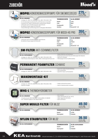 ZUBEH%u00d6RWDP01 KONDENSWASSERPUMPE F%u00dcR SW|WDC|DS|ED Art.Nr. 6910021%u2013 Verf%u00fcgbar f%u00fcr: SW22-FM, SW45-FB, LD44, WDC2-PRO, WDC4-PRO %u2013 F%u00fcr die ehemaligen kanadischen DS und ED Versionen verwendbar%u2013 Passend f%u00fcr div. andere Luftentfeuchter und Bautrockner-Marken%u2013 Entfeuchter wird an Kondensatpumpe angeschlossen%u2013 Bei defekter Pumpe stoppt der Entfeuchter%u2013 Einfache Montage und Demontage durch umklappbare BlechbalkenTECHNISCHE DATEN Art.Nr. 6910021Gewicht 2,3kgFarbe WeissPumpkapazit%u00e4t 5mAnschluss Raccord 3/4\275.-DTP INKL. 297.30LPREIS EXKL. 344.%u2013WDP02 KONDENSWASSERPUMPE F%u00dcR WDC8-HG PRO 350.-DTP INKL. 378.35LPREIS EXKL. 438.-Art.Nr. 6910022%u2013 Entfeuchter wird an Kondensatpumpe angeschlossen%u2013 Bei defekter Pumpe stoppt der EntfeuchterTECHNISCHE DATEN Art.Nr. 6910022Gewicht 3kgFarbe SchwarzPumpkapazit%u00e4t 5mAnschluss Raccord 3/4\TECHNISCHE DATEN Art.Nr. 6910022Gewicht 0.32 KGUrsprungsland SchwedenTECHNISCHE DATEN Art.Nr. 9370128009Gewicht 0.32 KGUrsprungsland SchwedenSM-FILTER ANTI-SCHIMMELFILTER 27.50DTP INKL. 29.70LPREIS EXKL. 35.-Art.Nr. 9370128005%u2013 Verf%u00fcgbar f%u00fcr: SW22-FM, SW45-FB, LD44, WDC2-PRO, WDC4-PRO %u2013 Filtert Staub, Schimmelsporen, Pollen, Nebel, metallurgischen Rauch und PERMANENT FOAMFILTER SCHWARZ 29.-DTP INKL. 31.35LPREIS EXKL. 37.%u2013Art.Nr. 9370128003%u2013 Verf%u00fcgbar f%u00fcr: SW22-FM, SW45-FB, LD44, WDC2-PRO, WDC4-PRO WANDMONTAGE-KIT 149.-DTP INKL. 161.05LPREIS EXKL. 187.%u2013Art.Nr. 6910011%u2013 Verf%u00fcgbar f%u00fcr: SW22-FM, SW45-FB, LD44, WDC2-PRO, WDC4-PRO %u2013 Optional verf%u00fcgbarWHG-1 THERMOHYGROMETERSUPER MOULD FILTER F%u00dcR WLD2NYLON STAUBFILTER F%u00dcR WLD232.5049.5039.50DTP INKL. 35.15LPREIS EXKL. 41.%u2013DTP INKL. 53.50LPREIS EXKL. 62.-DTP INKL. 42.70LPREIS EXKL. 50.-Art.Nr. 6910030%u2013 5 Funktionstasten MODE MAX/MIN, 12/24/ ALARM, C/F, SNOOZE%u2013 Zeit + Kalender eingebaut in den Wood%u2019s WHG-1Art.Nr. 6810086Art.Nr. 9370128009%u2013 Zeit in 12/24 H%u2013 Indoor Thermometer (0 %u00b0C bis +50 %u00b0C)%u2013 Indoor Hygrometer (20%u201395 %)%u2013 Alarm und Snooze%u2013 Einsatz bei starker Staubentwicklung%u2013 Filter auswaschbar%u2013 Speziell f%u00fcr Gipser und Handwerker%u2013 Stabile rostfreie Konstruktion%u2013 Ger%u00e4t ist vibrationssicher verankertSt%u00e4ube, Bakterien und Textilfasern %u2013 Kompressorschutz durch besseren Abtransport der Abw%u00e4rme%u2013 Optimal f%u00fcr Allergiker%u2013 Filterkategorie G3 mit Vorfilterfunktion14 Industriestrasse 3 | CH-8952 Schlieren | karlernstag.ch | alle Preise exkl. MwSt.
