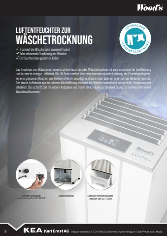 LUFTENTFEUCHTER ZURW%u00c4SCHETROCKNUNGDas Trocknen von W%u00e4sche mit einem Luftentfeuchter oder W%u00e4schetrockner ist sehr schonend f%u00fcr die Kleidung und %u00e4usserst energie- effizient. Die LD-Serie verf%u00fcgt %u00fcber eine beeindruckende Leistung, die Feuchtigkeitsprobleme in gr%u00f6sseren R%u00e4umen wie Kellern effektiv beseitigt und Schimmel, Spinnen und muffige Ger%u00fcche fernh%u00e4lt. Der starke Luftstrom aus der oberen Abluft%u00f6ffnung trocknet die W%u00e4sche schnell und verk%u00fcrzt die Trocknungszeit erheblich. Das schafft Zeit f%u00fcr andere Aufgaben und macht die LD-Serie zur idealen L%u00f6sung f%u00fcr Familien mit hohem W%u00e4scheaufkommen.Trocknet die W%u00e4sche sehr energieeffizientSehr schonende Trocknung der W%u00e4scheEntfeuchtet den gesamten KellerEinfache Schlauchanschlussoption f%u00fcr WLD 2 Zugentlastung Grosses Kondenswasserbecken von 11.4 Liter8 Industriestrasse 3 | CH-8952 Schlieren | karlernstag.ch | alle Preise exkl. MwSt.