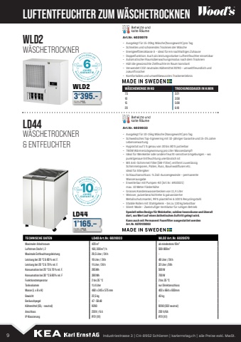 LUFTENTFEUCHTER ZUM W%u00c4SCHETROCKNENArt.Nr. 6020033%u2013 Ausgelegt f%u00fcr 10-15kg W%u00e4sche (Nassgewicht) pro Tag%u2013 Schwedisches Top-Egineering mit 10-j%u00e4hriger Garantie und 15-25 Jahre Lebenserwartung%u2013 Hygrostat auf 1 % genau von 30 bis 80 % justierbar%u2013 780W W%u00e4rmer%u00fcckgewinnung pro Liter Wasserdampf!%u2013 Ideal f%u00fcr Weinkeller oder andere feucht-sensitive Umgebungen %u2013 wo punktgenaue Entfeuchtung unerl%u00e4sslich ist%u2013 Mit Anti-Schimmel Filter (SM-Filter), entfernt zuverl%u00e4ssig Schimmelsporen, Pollen, Russ, Baumwollflusen etc. ideal f%u00fcr Allergiker%u2013 Schlauchanschluss: %u00be Zoll-Aussengewinde %u2013 permanente Wasserausgabe%u2013 Erweiterbar mit Pumpen-Kit (Art.Nr. 6910021) max. 10 Meter F%u00f6rderh%u00f6he%u2013 Grosses Kondenswasserbecken von 11,4 Liter%u2013 Weisser, pulverbeschichteter & galvanisierter Metallschutzmantel, 99 % plastikfrei & 100 % Recyclingstahl%u2013 Stabile Rollen mit Stahlgelenk %u2013 bis zu 130 kg belastbar%u2013 Silent-Mode %u2013 Zweistufiger Ventilator f%u00fcr ruhigen BetriebSpeziell edles Design f%u00fcr Weinkeller, sch%u00f6ne Innenr%u00e4ume und %u00fcberall dort, wo Wert auf einen %u00e4sthetischen Auftritt gelegt wird. Kann auch mit Permanent Foamfilter ausgestattet werden Art.Nr. 9370128003Art.Nr. 6020070%u2013 Ausgelegt f%u00fcr 15-20kg W%u00e4sche (Nassgewicht) pro Tag%u2013 Schnelles und schonendes Trocknen der W%u00e4sche%u2013 Enerigieeffzienzklasse A %u2013 ideal f%u00fcr ein nachhaltiges Zuhause%u2013 Doppelfunktion: Auch als leistungsstarker Luftentfeuchter einsetzbar%u2013 Automatischer Raum%u00fcberwachungsmodus nach dem Trocknen%u2013 H%u00e4lt die gew%u00fcnschte Zielfeuchte im Raum konstant%u2013 Verwendet CO2-neutrales K%u00e4ltemittel R290 %u2013 umweltfreundlich und zukunftssicher%u2013 Komfortables und umweltbewusstes TrockenerlebnisLD44WLD2LD44WLD2W%u00c4SCHETROCKNER& ENTFEUCHTERW%u00c4SCHETROCKNERTECHNISCHE DATEN LD40 Art.Nr. 6020033Maximaler Arbeitsraum 420m%u00b3Luftstrom Stufe 1, 2 160, 300m%u00b3/hMaximale Entfeuchtungsleistung 29,5 Liter/24hLeistung bei 30 %u00b0C & 80% rel. F. 19 Liter/24hLeistung bei 20 %u00b0C & 70% rel. F. 11 Liter/24hKonsumation bei 20 %u00b0C & 70% rel. F. 285WhKonsumation bei 30 %u00b0C & 80% rel. F 390WhFunktionstemperatur 2 bis 35 %u00b0CTankvolumen 11,4 LiterMasse (L x B x H) 460 x 345 x 575 mmGewicht 22,5kgGer%u00e4uschpegel 47%u201358dBK%u00e4ltemittel (CO%u2082 %u2013 neutral) R290Anschluss 230 V/6 AIP Klassierung IP21 (X1)1%u2019165.%u2013DTP INKL. 1%u2019259.35LPREIS EXKL. 1%u2019457.%u20133%u2018395.-DTP INKL. 3%u2018670.00LPREIS EXKL. 4%u2018244.-WLD2 Art.Nr. 6020070ab mindestens 10m3500-800m3-48 Liter/24h32 Liter /24h500 W700 W2 bis 35 %u00b0Cnur Direktanschluss403 x 664 x 650mm43 kg-R290 (CO2 neutral)230 V/6AIP21 (X1)W%u00c4SCHEMENGE IN KG TROCKUNGSDAUER IN H:MIN7.5 3:2110 3:5815 5:0820 6:189 Industriestrasse 3 | CH-8952 Schlieren | karlernstag.ch | alle Preise exkl. MwSt.
