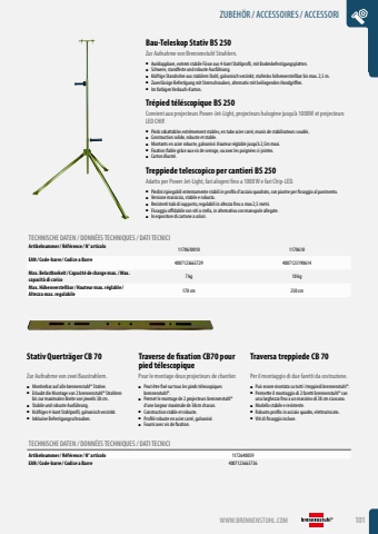 WWW.BRENNENSTUHL.COM 101ZUBEH%u00d6R / ACCESSOIRES/ ACCESSORIBau-Teleskop Stativ BS 250Zur Aufnahme von Brennenstuhl Strahlern.%u25a0 Ausklappbare, extrem stabile F%u00fcsse aus 4-kant Stahlprofil, mit Bodenbefestigungsplatten.%u25a0 Schwere, standfeste und robuste Ausf%u00fchrung.%u25a0 Kr%u00e4ftige Standrohre aus stabilem Stahl, galvanisch verzinkt, stufenlos h%u00f6henverstellbar bis max. 2,5 m.%u25a0 Zuverl%u00e4ssige Befestigung mit Sternschrauben, alternativ mit beiliegenden Handgriffen.%u25a0 Im farbigen Verkaufs-Karton.Tr%u00e9pied t%u00e9l%u00e9scopique BS 250Convient aux projecteurs Power-Jet-Light, projecteurs halog%u00e8ne jusqu%u2019%u00e0 1000W et projecteurs LED CHIP.%u25a0 Pieds rabattables extr%u00eamement stables, en tube acier carr%u00e9, munis de stabilisateurs soud%u00e9s.%u25a0 Construction solide, robuste et stable.%u25a0 Montants en acier robuste, galvanis%u00e9. Hauteur r%u00e9glable jusqu%u2019%u00e0 2,5m maxi.%u25a0 Fixation fiable gr%u00e2ce aux vis de serrage, ou avec les poign%u00e9es ci-jointes.%u25a0 Carton illustr%u00e9.Treppiede telescopico per cantieri BS 250Adatto per Power Jet-Light, fari alogeni fino a 1000 W e fari Chip-LED.%u25a0 Piedini ripiegabili estremamente stabili in profilo d%u2019acciaio quadrato, con piastre per fissaggio al pavimento.%u25a0 Versione massiccia, stabile e robusta.%u25a0 Resistenti tubi di supporto, regolabili in altezza fino a max 2,5 metri.%u25a0 Fissaggio affidabile con viti a stella, in alternativa con manopole allegate.%u25a0 In espositore di cartone a colori.TECHNISCHE DATEN / DONN%u00c9ES TECHNIQUES / DATI TECNICIArtikelnummer/ R%u00e9f%u00e9rence / N%u00b0 articolo 1170610010 1170610EAN/ Code-barre / Codice a Barre 4007123663729 4007123190614Max. Belastbarkeit/ Capacit%u00e9 de charge max./ Max. capacit%u00e0 di carico 7 kg 10 kgMax. H%u00f6henverstellbar/ Hauteur max. r%u00e9glable / Altezza max. regolabile 170 cm 250 cmStativ Quertr%u00e4ger CB 70 Traverse de fixation CB70 pour pied t%u00e9lescopiqueTraversa treppiede CB 70Zur Aufnahme von zwei Baustrahlern. Pour le montage deux projecteurs de chantier. Per il montaggio di due faretti da costruzione.%u25a0 Montierbar auf alle brennenstuhl%u00ae Stative.%u25a0 Erlaubt die Montage von 2 brennenstuhl%u00ae Strahlern bis zur maximalen Breite von jeweils 38 cm.%u25a0 Stabile und robuste Ausf%u00fchrung.%u25a0 Kr%u00e4ftiges 4-kant Stahlprofil, galvanisch verzinkt.%u00a0%u25a0 Inklusive Befestigungsschrauben.%u25a0 Peut %u00eatre fix%u00e9 sur tous les pieds t%u00e9lescopiques brennenstuhl%u00ae.%u25a0 Permet le montage de 2 projecteurs brennenstuhl%u00ae d%u2019une largeur maximale de 38cm chacun.%u25a0 Construction stable et robuste.%u25a0 Profil%u00e9 robuste en acier carr%u00e9, galvanis%u00e9.%u25a0 Fourni avec vis de fixation.%u25a0 Pu%u00f2 essere montata su tutti i treppiedi brennenstuhl%u00ae.%u25a0 Permette il montaggio di 2 faretti brennenstuhl%u00ae con una larghezza fino a un massimo di 38 cm ciascuno.%u25a0 Modello stabile e resistente.%u25a0 Robusto profilo in acciaio quadro, elettrozincato.%u25a0 Viti di fissaggio incluse.TECHNISCHE DATEN / DONN%u00c9ES TECHNIQUES / DATI TECNICIArtikelnummer/ R%u00e9f%u00e9rence / N%u00b0 articolo 1172640059EAN/ Code-barre / Codice a Barre 4007123663736