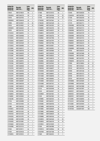 Artikel-Nr. Article No. Article No.Barcode 4007123...Seite Page PageVPE1170610 4007123190614 101 21170610010 4007123663729 101 21170790 4007123619702 71 61170850010 4007123646418 69 11170900 4007123249817 55 501170910 4007123249831 54 241170950010 4007123646425 69 11170970 4007123611812 70 11171250142 4007123684953 52 11171250242 4007123684960 52 11171250245 4007123676552 29 11171250342 4007123684977 52 11171250345 4007123676569 29 11171250542 4007123684984 52 11171250842 4007123685127 52 11171252040 4007123685196 24 11171252046 4007123684939 43 11171252047 4007123685035 24 11171252343 4007123684809 24 11171252346 4007123684915 43 11171252546 4007123684922 43 11171252547 4007123685028 24 11171252730 4007123685172 44 11171252740 4007123685202 24 11171252746 4007123684946 44 11171252747 4007123685042 24 11171252843 4007123685158 24 11171252846 4007123685097 43 11171252930 4007123685189 44 11171252940 4007123685219 24 11171252943 4007123685165 24 11171252946 4007123685103 44 11171620010 4007123668212 37 11171650001 4007123303854 20 11171652200 4007123303311 20 11171720 4007123304998 65 11171730 4007123310104 64 11171800 4007123681228 92 11171810013 4007123312825 41 11171810075 4007123313242 40 11171810150 4007123313259 40 11171810230 4007123312795 40 11171810300 4007123313990 401171810450 4007123312801 41 11171810650 4007123312818 41 11171810900 4007123311514 41 11171820 4007123310111 66 11171830 4007123310128 67 11171830016 4007123310142 67 1Artikel-Nr. Article No. Article No.Barcode 4007123...Seite Page PageVPE1171860 4007123310135 68 11171900 4007123619344 55 501171910 4007123619368 54 501171962303 4007123675661 26 11171962503 4007123675678 26 11172640002 4007123653201 101 81172640005 4007123654192 102 81172640010 4007123658275 98 81172640012 4007123670970 37 11172640059 4007123663736 99 21172640063 4007123677948 19 11172640064 4007123677979 19 11172640065 4007123677986 19 11172640066 4007123676071 19 11172640072 4007123681853 19 11172640073 4007123681860 19 11172640078 4007123685349 19 11172640080 4007123685363 19 11172640081 4007123685370 19 11172640082 4007123685639 99 11173070010 4007123674442 36 11173070020 4007123674459 36 11173090100 4007123668397 39 11173100100 4007123668434 32 11173110100 4007123668441 32 11173110200 4007123668458 33 11173110300 4007123668465 34 11173140400 4007123676613 16 11173142600 4007123677672 16 11173190010 4007123676637 96 11173210 4007123610440 96 41173220 4007123610457 95 11173240020 4007123674381 97 11173290 4007123637683 94 11173700005 4007123681303 38 11173702001 4007123681921 12 11173702003 4007123681938 14 11173730000 4007123681396 18 11173750002 4007123684649 88 11173750003 4007123684656 87 11173750005 4007123684670 86 11173780000 4007123681426 62 11175420010 4007123641628 81 101175430010 4007123663149 78 101175470012 4007123310449 73 11175580 4007123667888 74 11175590110 4007123690466 80 101175670100 4007123671588 76 61175680 4007123663422 75 1Artikel-Nr. Article No. Article No.Barcode 4007123...Seite Page PageVPE1176440 4007123648238 79 11176462010 4007123679935 72 11177300 4007123656769 90 21177310 4007123667918 89 11177370 4007123657711 77 11178010900 4007123675708 45 11178010901 4007123675715 53 11178020900 4007123675722 45 11178020901 4007123675739 53 11178030900 4007123675746 45 11178030901 4007123675753 53 11178600201 4007123663170 85 11178600401 4007123663224 83 11178600601 4007123663156 84 11178600800 4007123663408 83 11178760 4007123636723 91 11179050000 4007123674688 48 11179050010 4007123674695 48 11179060000 4007123674701 50 11179060010 4007123674718 50 11179900 4007123188963 60 251179910 4007123301621 60 251270120 4007123031344 58 41270400 4007123031368 59 41270420 4007123031375 59 41270700 4007123031412 59 21270720 4007123031429 59 21270780900 4007123678204 57 11270790900 4007123674282 56 11294870140 4007123672080 61 11294870270 4007123672097 61 11294870271 4007123681051 63 11294870272 4007123681068 63 11294870273 4007123681075 63 19171320401 4007123668403 28 19171332121 4007123670468 21 19171332801 4007123670444 21 19171652300 4007123310692 20 19171991100 3281859911007 100 1