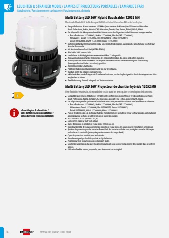 Multi Battery LED 360%u00b0 Hybrid Baustrahler 12052 MHMaximale Flexibilit%u00e4t. Volle Kompatibilit%u00e4t mit den f%u00fchrenden Akku-Technologien.%u25a0 Kompatibel mit ca. 44 verschiedenen 18V Akkus (verschiedene Ah Klassen) der 10 Powertool-Hersteller: Bosch Professional, Makita, Metabo/CAS, Milwaukee, Dewalt, Flex, Festool, Einhell, W%u00fcrth, Hikoki .%u25a0 Die Adapter f%u00fcr die Akkusysteme ihrer Wahl k%u00f6nnen unter den folgenden Artikel-Nummern bezogen werden:%u2013 Bosch Professional 1172640063, Makita 1172640064, Metabo/CAS 1172640065, Milwaukee + Dewalt 1172640066, Flex 1172640072, Festool 1172640073, Einhell 1172640078, W%u00fcrth 1172640080, Hikoki 1172640081 %u25a0 Mehr Flexibilit%u00e4t durch Hybridtechnik: Akku- und Netzbetrieb m%u00f6glich, automatische Umschaltung von Netz auf Akku bei Stromausfall.%u25a0 Mit fest installiertem 5 m Kabel (H07RN-F2X1,0).%u25a0 Sehr helles 360%u00b0 rundum Licht.%u25a0 Leuchtdauer in Abh%u00e4ngigkeit des verwendeten Akkus 12 min pro Ah.%u25a0 Akku-Zustandsanzeige f%u00fcr die Restenergie des eingesetzten Akkus, die Akkus sind extern zu laden.%u25a0 Schutzsystem f%u00fcr Power-Tool Akkus: Die eingesetzten Akkus sind vor Tiefenentladung und %u00dcberhitzung (hervorgerufen durch hohe Laststr%u00f6me) gesch%u00fctzt.%u25a0 Abnehmbare Akku Schutzhaube.%u25a0 Praktische Kabelaufwicklung m%u00f6glich und Clip zur Befestigung.%u25a0 Rundum-Griffe f%u00fcr einfaches Transportieren.%u25a0 Inklusive Haken zum Aufh%u00e4ngen mit Schiebemechanismus, um das Ungleichgewicht durch den eingesetzten Akku ausgleichen zu k%u00f6nnen.%u25a0 Flexible Nutzung: Stehend, h%u00e4ngend, auf Stativ montierbar.Multi Battery LED 360%u00b0 Projecteur de chantier hybride 12052 MHUne flexibilit%u00e9 maximale. Compatibilit%u00e9 totale avec les principales technologies de batteries.%u25a0 Compatible avec environ 44 batteries 18V diff%u00e9rentes (diff%u00e9rentes classes Ah) des 10 fabricants de powertools%u00a0: Bosch Professional, Makita, Metabo/CAS, Milwaukee, Dewalt, Flex, Festool, Einhell, W%u00fcrth, Hikoki .%u25a0 Les adaptateurs pour les syst%u00e8mes de batterie de votre choix peuvent %u00eatre obtenus sous les r%u00e9f%u00e9rences suivantes%u00a0:%u2013 Bosch Professional 1172640063, Makita 1172640064, Metabo/CAS 1172640065, Milwaukee + Dewalt 1172640066, Flex 1172640072, Festool 1172640073, Einhell 1172640078, W%u00fcrth 1172640080, Hikoki 1172640081 %u25a0 Plus de flexibilit%u00e9 gr%u00e2ce %u00e0 la technique hybride%u00a0: fonctionnement sur batterie et sur secteur possible, commutation automatique du secteur %u00e0 la batterie en cas de panne de courant.%u25a0 Avec c%u00e2ble fixe de 5 m (H07RN-F2X1,0).%u25a0 Lumi%u00e8re tr%u00e8s claire sur 360%u00b0 tout autour.%u25a0 Dur%u00e9e d%u2019%u00e9clairage en fonction de l%u2019accu utilis%u00e9 12 min par Ah.%u25a0 Indicateur de l%u2019%u00e9tat de l%u2019accu pour l%u2019%u00e9nergie restante de l%u2019accu utilis%u00e9, les accus doivent %u00eatre charg%u00e9s %u00e0 l%u2019ext%u00e9rieur.%u25a0 Syst%u00e8me de protection pour les batteries Power-Tool%u00a0: les batteries utilis%u00e9es sont prot%u00e9g%u00e9es contre les d%u00e9charges profondes et la surchauffe (provoqu%u00e9e par des courants de charge %u00e9lev%u00e9s).%u25a0 Capot de protection amovible pour les batteries.%u25a0 Enroulement pratique du c%u00e2ble possible et clip de fixation.%u25a0 Poign%u00e9es sur tout le pourtour pour un transport facile.%u25a0 Crochet de suspension inclus avec m%u00e9canisme coulissant pour pouvoir compenser le d%u00e9s%u00e9quilibre d%u00fb %u00e0 la batterie utilis%u00e9e.%u25a0 Utilisation flexible%u00a0: debout, suspendu, peut %u00eatre mont%u00e9 sur un tr%u00e9pied.ohne Adapter & ohne Akku /sans batterie & sans adaptateur / i senza batteria e senza adattatoriLEUCHTEN & STRAHLER MOBIL/LAMPES ET PROJECTEURS PORTABLES/LAMPADE E FARIAkkubetrieb/ Fonctionnement sur batterie/ Funzionamento a batteria14 WWW.BRENNENSTUHL.COM