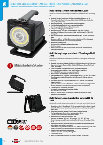 Multi Battery LED Akku Handleuchte HL 3000Maximale Flexibilit%u00e4t. Volle Kompatibilit%u00e4t mit den f%u00fchrenden Akku-Technologien.%u25a0 Kompatibel mit ca. 44 verschiedenen 18V Akkus (verschiedene Ah Klassen) der 10 Powertool-Hersteller: Bosch Professional, Makita, Metabo/CAS, Milwaukee, Dewalt, Flex, Festool, Einhell, W%u00fcrth, Hikoki .%u25a0 Arbeitsleuchte inklusive Schnittstellen Adapter f%u00fcr genannte Hersteller. %u25a0 2 in 1 Handleuchte und Strahler in einem - max. Leuchtweite 200 m.%u25a0 Mit 1140 superhellen SMD LEDs als perfekter Scheinwerfer. %u25a0 Lichtring mit 2160lm geeignet f%u00fcr Fl%u00e4chenlicht. %u25a0 Schalter mit Funktion: 100% Spot - 100% Fl%u00e4chenlicht - 75% - 50% - 25% Licht.%u25a0 Leuchtdauer in Abh%u00e4ngigkeit des verwendeten Akkus Spot 100 min pro Ah / Fl%u00e4chenlicht 50min pro Ah.%u25a0 Akku-Zustandsanzeige f%u00fcr die Restenergie des eingesetzten Akkus, die Akkus sind extern zu laden.%u25a0 Schutzsystem f%u00fcr Power-Tool Akkus: Die eingesetzten Akus sind vor Tiefenentladung und %u00dcberhitzung (hervorgerufen durch hohe Laststr%u00f6me) gesch%u00fctzt.%u25a0 Abnehmbare Akku Schutzhaube.%u25a0 Mit ergonomischem Griff und verstellbarem Magnetfuss.%u25a0 Mit Ein/Aus Schalter.%u25a0 BGI608 K2: Einsatz f%u00fcr den rauen Betrieb mit hohen mechanischen, physikalischen und chemischen EinwirkungenMulti Battery Lampe portative %u00e0 LED rechargeable HL 3000Une flexibilit%u00e9 maximale. Compatibilit%u00e9 totale avec les principales technologies de batteries.%u25a0 Compatible avec environ 44 batteries 18V diff%u00e9rentes (diff%u00e9rentes classes Ah) des 10 fabricants de powertools%u00a0: Bosch Professional, Makita, Metabo/CAS, Milwaukee, Dewalt, Flex, Festool, Einhell, W%u00fcrth, Hikoki .%u25a0 Lampe de travail avec adaptateur d%u2019interface pour les fabricants mentionn%u00e9s. %u25a0 Lampe portative et projecteur 2 en 1 en un - port%u00e9e lumineuse max. 200 m.%u25a0 Avec 1140 LED SMD super claires comme projecteur parfait. %u25a0 Anneau lumineux de 2160lm adapt%u00e9 %u00e0 l%u2019%u00e9clairage de surface. %u25a0 Interrupteur avec fonction%u00a0: 100% spot - 100% lumi%u00e8re de surface - 75% - 50% - 25% lumi%u00e8re.%u25a0 Dur%u00e9e d%u2019%u00e9clairage en fonction de l%u2019accu utilis%u00e9 Spot 100 min par Ah / %u00e9clairage de surface 50min par Ah.%u25a0 Indicateur de l%u2019%u00e9tat de l%u2019accu pour l%u2019%u00e9nergie restante de l%u2019accu utilis%u00e9, les accus doivent %u00eatre charg%u00e9s %u00e0 l%u2019ext%u00e9rieur.%u25a0 Syst%u00e8me de protection pour les batteries Power-Tool%u00a0: les accus utilis%u00e9s sont prot%u00e9g%u00e9s contre la d%u00e9charge profonde et la surchauffe (provoqu%u00e9e par des courants de charge %u00e9lev%u00e9s).%u25a0 Capot de protection amovible pour les batteries.%u25a0 Avec poign%u00e9e ergonomique et pied magn%u00e9tique r%u00e9glable.%u25a0 Avec interrupteur marche/arr%u00eat.%u25a0 BGI608 K2%u00a0: Utilisation pour un fonctionnement rude avec des influences m%u00e9caniques, physiques et chimiques %u00e9lev%u00e9es.Multi Battery Lampada portatile a batteria LED HL 3000Massima flessibilit%u00e0. Piena compatibilit%u00e0 con le principali tecnologie di batterie.%u25a0 Compatibile con circa 44 diverse batterie 18V (diverse classi di Ah) dei 10 produttori di utensili elettrici: Bosch Professional, Makita, Metabo/CAS, Milwaukee, Dewalt, Flex, Festool, Einhell, W%u00fcrth, Hikoki .%u25a0 Luce di lavoro compresi gli adattatori di interfaccia per i produttori nominati. %u25a0 2 in 1 lampada a mano e riflettore in uno - portata massima 200 m.%u25a0 Con 1140 LED SMD super luminosi come riflettore perfetto. %u25a0 Anello luminoso con 2160lm adatto alla luce di zona. %u25a0 Interruttore con funzione: 100% spot - 100% area light - 75% - 50% - 25% light.%u25a0 Durata della luce a seconda della batteria utilizzata Spot 100 min per Ah / luce d%u2019area 50min per Ah.%u25a0 Visualizzazione dello stato della batteria per l%u2019energia rimanente della batteria utilizzata, le batterie devono essere caricate esternamente.%u25a0 Sistema di protezione per le batterie del Power-Tool: Le batterie utilizzate sono protette contro la scarica profonda e il surriscaldamento (causato da correnti di carico elevate).%u25a0 Coperchio di protezione della batteria rimovibile.%u25a0 Con manico ergonomico e base magnetica regolabile.%u25a0 Con interruttore on/off.%u25a0 BGI608 K2: Usare per operazioni grezze con alti effetti meccanici, fisici e chimici.i inkl. Adapter / incl. adaptateur / incl. adattatoreMilwaukee, Dewalt, Makita, Bosch, Metabo, Flex, Festool18 WWW.BRENNENSTUHL.COMLEUCHTEN & STRAHLER MOBIL/LAMPES ET PROJECTEURS PORTABLES/LAMPADE E FARIAkkubetrieb/ Fonctionnement sur batterie/ Funzionamento a batteriaBGI608K2 IP54 IK08 +2160LUMEN1140200m