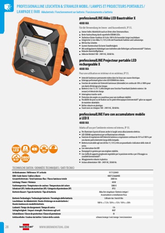 28 WWW.BRENNENSTUHL.COMPROFESSIONALLINE LEUCHTEN & STRAHLER MOBIL/LAMPES ET PROJECTEURS PORTABLES/LAMPADE E FARI Akkubetrieb/ Fonctionnement sur batterie/ Funzionamento a batteriaprofessionalLINE Akku LED Baustrahler X4000 MAF%u00fcr die Verwendung im Innen- und Aussenbereich, IP 55.%u25a0 Immer helles Arbeitslicht auch an Orten ohne Stromanschluss.%u25a0 Beste Ausleuchtung durch superhelle OSRAM LEDs.%u25a0 Stufenlose Dimm-Funktion 10 % bis 100 % f%u00fcr besonders lange Leuchtdauer.%u25a0 Integrierter Li-Ion-Akku 11,1 V/5,4 Ah mit Powerbank Funktion und Ladeanzeige.%u25a0 Mit Ein/Aus Schalter.%u25a0 Gummi-Kantenschutz f%u00fcr beste Standfestigkeit.%u25a0 Mit ausklappbarem Halteb%u00fcgel zum Aufstellen oder Befestigen auf brennenstuhl%u00ae Stativen.%u25a0 Robustes Kunststoffgeh%u00e4use.%u25a0 Inklusive Netzteil 100 - 240 V AC, 50/60 Hz.professionalLINE Projecteur portable LED rechargeable X4000 MAPour une utilisation en int%u00e9rieur et en ext%u00e9rieur, IP 55.%u25a0 Intensit%u00e9 lumineuse permanente m%u00eame dans les lieux sans source %u00e9lectrique.%u25a0 Eclairage performant gr%u00e2ce %u00e0 des LED OSRAM tr%u00e8s claires.%u25a0 Fonction de variation de l%u2019intensit%u00e9 lumineuse (dimmable) en continu de 10% %u00e0 100% pour une dur%u00e9e d%u2019%u00e9clairage plus longue.%u25a0 Batterie Li-Ion 11,1 V / 5,4Ah int%u00e9gr%u00e9e avec fonction Powerbank (batterie externe / de secours) et t%u00e9moin de charge.%u25a0 Interrupteur marche-arr%u00eat.%u25a0 Protection des angles en caoutchouc pour une meilleure stabilit%u00e9.%u25a0 Possibilit%u00e9 de pose ou de fixation sur les pieds t%u00e9lescopiques brennenstuhl%u00ae gr%u00e2ce au support de maintien rabattable.%u25a0 Bo%u00eetier robuste en plastique.%u25a0 Fourni avec un chargeur 100 - 240 V AC, 50/60 Hz.professionalLINE Faro con accumulatore mobile a LED X4000 MAAdatta all%u2019uso per l%u2019ambiente esterno ed interno, IP 55.%u25a0 Per illuminare il posto di lavoro anche in luoghi senza allacciamento elettrico.%u25a0 LED OSRAM superluminosi per un%u2019illuminazione ottimale.%u25a0 Funzione di regolazione dell%u2019intensit%u00e0 luminosa a regolazione continua da 10 % al 100 % per una durata particolarmente lunga della lampada.%u25a0 Batteria ricaricabile agli ioni di litio 11,1 V/5,4 Ah con powerbank e indicatore dello stato di carica.%u25a0 Con interruttore On/Off.%u25a0 Paraspigoli in gomma per una migliore stabilit%u00e0.%u25a0 Con staffa di supporto pieghevole regolabile per la posizione eretta o per il fissaggio su cavalletti brennenstuhl%u00ae.%u25a0 Alloggiamento robusto in plastica.%u25a0 Incluso alimentatore 100 - 240 V AC, 50/60 Hz.TECHNISCHE DATEN / DONN%u00c9ES TECHNIQUES / DATI TECNICIArtikelnummer/ R%u00e9f%u00e9rence / N%u00b0 articolo 9171320401EAN/ Code-barre / Codice a Barre 4007123668403Gesamtlichtstrom / Total luminous flux / Flusso luminoso totale 3800 lmLeistung / Power / Potenza 40 WFarbtemperatur/ Temp%u00e9rature de couleur/ Temperatura del colore 5000 KSchutzart (IP)/ Indice de protection (IP)/ Categoria di protezione (IP) IP55Batterie Bauart/ Type de batterie / Tipo di batteria Akku fest eingebaut/ Batterie int%u00e9gr%u00e9/ Accumulatore a installazione fissaBatterie Technologie / Technologie batterie / Tecnologia della batteria Lithium-Ion / Ioni di litioLeuchtdauer im Akkubetrieb / Dur%u00e9e d%u2018%u00e9clairage en mode batterie / Durata luminosa in modalit%u00e0 batteria 100 % = 7.5 h / 50 % = 15 h / 10 % = 30 hLadezeit/ Temps de chargement/ Tempo di carica 5 hSchlagfestigkeit / Impact strength / Resistenza agli urti IK07Schutzklasse / Classe de protection / Classe di protezione IIIGeh%u00e4usefarbe / Couleur du bo%u00eetier/ Colore della scatola schwarz/orange/ noir/orange/ nero/arancioneOSRAMLED USB POWERBANKLi-IonINCLUSIVE 30h MAX. IP 55IK073800LUMEN