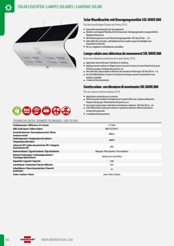 66 WWW.BRENNENSTUHL.COMSOLAR LEUCHTEN /LAMPES SOLAIRES/LAMPADE SOLARISolar Wandleuchte mit Bewegungsmelder SOL WAVE 800F%u00fcr den kurzfristigen Einsatz im Freien, IP 65.%u25a0 Universelle Anwendung f%u00fcr den Aussenbereich.%u25a0 Moderne und elegante Wandleuchte f%u00fcr Hauswand, T%u00fcreingangsbereich, Garageneinfahrt, Wegbeleuchtung usw.%u25a0 Mit D%u00e4mmerungssensor und Infrarot Bewegungsmelder 120%u00b0/6m/20 Sek. %u2013 5 h.%u25a0 Helle SMD LEDs im Vorder- und R%u00fcckbereich der Leuchte sorgen f%u00fcr Helligkeit und angenehmes Ambiente.%u25a0 Bis zu 3 m%u00f6glichen Lichtfunktionen einstellbar.Lampe solaire avec d%u00e9tecteur de mouvement SOL WAVE 800Pour une utilisation ext%u00e9rieure de courte dur%u00e9e, IP 65.%u25a0 Application universelle pour l%u2019utilisation en ext%u00e9rieur.%u25a0 Applique murale moderne et %u00e9l%u00e9gante pour le mur de la maison, la zone d%u2019entr%u00e9e de la porte, l%u2019entr%u00e9e du garage, l%u2019%u00e9clairage des parcours, etc.%u25a0 Avec d%u00e9tecteur cr%u00e9pusculaire et d%u00e9tecteur de mouvement infrarouge 120%u00b0/6m/20 sec - 5 h.%u25a0 Des LED SMD brillantes %u00e0 l%u2019avant et %u00e0 l%u2019arri%u00e8re de la lampe assurent la luminosit%u00e9 et une ambiance agr%u00e9able.%u25a0 3 modes de fonctionnement.Faretto solare con rilevatore di movimento SOL WAVE 800Per uso esterno di breve durata, IP 65.%u25a0 Applicazione universale per uso esterno.%u25a0 Faretto da parete moderno ed elegante per la parete della casa, l%u2019ingresso della porta, l%u2019ingresso del garage, l%u2019illuminazione del percorso, ecc.%u25a0 Con sensore crepuscolare e rilevatore di movimento a infrarossi 120%u00b0/6m/20 sec - 5 h.%u25a0 I LED SMD luminosi nella parte anteriore e posteriore della luce offrono luminosit%u00e0 e un%u2019atmosfera piacevole.%u25a0 3 modalit%u00e0 di funzionamento. GREEN ENERGYGREEN ENERGY800LUMEN 120%u00b0 Li-IonINCLUSIVE 10mMAX. IP65TECHNISCHE DATEN / DONN%u00c9ES TECHNIQUES / DATI TECNICIArtikelnummer/ R%u00e9f%u00e9rence / N%u00b0 articolo 1171820EAN/ Code-barre / Codice a Barre 4007123310111Gesamtlichtstrom/ Flux lumineux total/ Flusso luminoso totale 800 lmFarbtemperatur/ Temp%u00e9rature de couleur/ Temperatura del colore 6000 KSchutzart (IP)/ Indice de protection (IP)/ Categoria di protezione (IP) IP65Batterie Bauart/ Type de batterie / Tipo di batteria Akkupack/ Bloc batteries/ Pacco batteriaBatterie Technologie / Technologie batterie / Tecnologia della batteria Lithium-Ion / Ioni di litioKapazit%u00e4t/ Capacit%u00e9 / Capacit%u00e0 4 AhLeuchtdauer/ Autonomie / Durata della luce 24 hSchutzklasse / Classe de protection / Classe di protezione IIIFarbe / Couleur/ Colore weiss/ blanc/ bianco