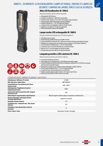 ARBEITS-, SICHERHEITS- & TASCHENLAMPEN /LAMPE DE TRAVAIL, TORCHES ET LAMPES DE S%u00c9CURIT%u00c9/LAMPADE DA LAVORO, TORCE E LUCI DI SICUREZZAAkku LED Handleuchte HL 1000 AMaximale Lichtleistung f%u00fcr h%u00f6chste Anspr%u00fcche.%u25a0 Mit superheller COB-LED vorne.%u25a0 Zus%u00e4tzliche Schaltstufe f%u00fcr 1 SMD LED im Leuchtenkopf.%u25a0 Stufenlose Dimm-Funktion 10 % bis 100 % f%u00fcr besonders lange Leuchtdauer.%u25a0 Gummierung f%u00fcr erh%u00f6hte Stossfestigkeit und beste Griffigkeit.%u25a0 Knickbarer Haltefuss bis +/- 60%u00b0 mit integriertem Magnet.%u25a0 2 Magnete hinten und ausklappbarer Haken f%u00fcr flexiblen Einsatz.%u25a0 Integrierter Li-Ion-Akku 3,7 V/4,4 Ah mit Ladeanzeige.%u25a0 USB Ladeschnittstelle, inklusive USB Ladekabel.Lampe torche LED rechargeable HL 1000 APuissance lumineuse maximale pour les hautes exigences.%u25a0 LED COB tr%u00e8s claire en fa%u00e7ade.%u25a0 Mode d%u2019%u00e9clairage suppl%u00e9mentaire par la LED SMD en frontal.%u25a0 Fonction dimmable en continu de 10% %u00e0 100% pour une dur%u00e9e d%u2019%u00e9clairage particuli%u00e8rement longue.%u25a0 Rev%u00eatement en caoutchouc pour une r%u00e9sistance accrue aux impacts et une meilleure adh%u00e9rence.%u25a0 Socle de maintien orientable jusqu%u2019%u00e0 +/- 60%u00b0 avec aimant int%u00e9gr%u00e9.%u25a0 2 aimants au dos et 1 crochet escamotable pour une utilisation facile.%u25a0 Batterie Li-Ion 3,7 V/4,4 Ah int%u00e9gr%u00e9e avec t%u00e9moin de charge.%u25a0 Chargement par prise USB, c%u00e2ble de raccordement USB fourni.Lampada portatile a LED a batteria HL 1000 AMassima potenza luminosa per tutte le esigenze.%u25a0 Con frontale LED COB super luminoso.%u25a0 Stadio aggiuntivo di commutazione per 1 LED SMD nella testa della lampada.%u25a0 Funzione di regolazione dell%u2019intensit%u00e0 luminosa a regolazione continua da 10 % al 100 % per una durata particolarmente lunga della lampada.%u25a0 Rivestimento in gomma per una maggiore resistenza all%u2019impatto e migliore aderenza.%u25a0 Piede di supporto pieghevole fino a +/- 60%u00b0 con magnete integrato.%u25a0 2 magneti sul retro e gancio pieghevole per un uso flessibile.%u25a0 Batteria ricaricabile integrata agli ioni di litio 3,7 V/4,4 Ah con spia di carica.%u25a0 Interfaccia di carica USB, con incluso cavetto di carica USB.COBLED USB RECHARGEABLELi-IonINCLUSIVE MAX.24h360%u00b0 +200LUMEN1000IP54TECHNISCHE DATEN / DONN%u00c9ES TECHNIQUES / DATI TECNICIArtikelnummer/ R%u00e9f%u00e9rence / N%u00b0 articolo 1175680EAN/ Code-barre / Codice a Barre 4007123663422Gesamtlichtstrom/ Flux lumineux total/ Flusso luminoso totale 1000 + 200 lmFarbtemperatur/ Temp%u00e9rature de couleur/ Temperatura del colore 6500 KSchutzart (IP)/ Indice de protection (IP)/ Categoria di protezione (IP) IP54Batterie Bauart/ Type de batterie / Tipo di batteria Akku fest eingebaut/ Batterie int%u00e9gr%u00e9/ Accumulatore a installazione fissaBatterie Technologie / Technologie batterie / Tecnologia della batteria Lithium-Ion / Ioni di litioSpannung / Tension / Tensione 3.7 VLeuchtdauer max./ Autonomie max./ Max. durata della luce 24 hSchutzklasse / Classe de protection / Classe di protezione IIIFarbe / Couleur/ Colore schwarz/grau/ noir/gris/ nero/grigioWWW.BRENNENSTUHL.COM 75ARBEITS-, SICHERHEITS- & TASCHENLAMPEN /LAMPE DE TRAVAIL, TORCHES ET LAMPES DE S%u00c9CURIT%u00c9/LAMPADE DA LAVORO, TORCE E LUCI DI SICUREZZA