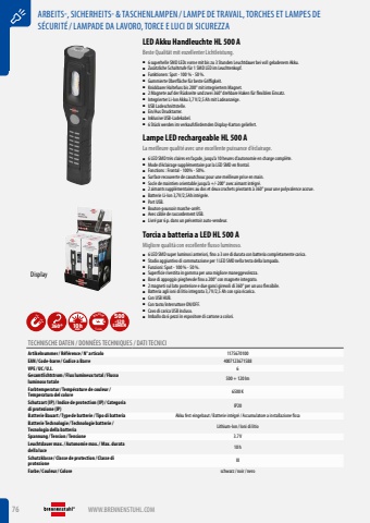 76 WWW.BRENNENSTUHL.COMARBEITS-, SICHERHEITS- & TASCHENLAMPEN /LAMPE DE TRAVAIL, TORCHES ET LAMPES DE S%u00c9CURIT%u00c9/LAMPADE DA LAVORO, TORCE E LUCI DI SICUREZZALED Akku Handleuchte HL 500 ABeste Qualit%u00e4t mit exzellenter Lichtleistung.%u25a0 6 superhelle SMD LEDs vorne mit bis zu 3 Stunden Leuchtdauer bei voll geladenem Akku.%u25a0 Zus%u00e4tzliche Schaltstufe f%u00fcr 1 SMD LED im Leuchtenkopf.%u25a0 Funktionen: Spot - 100 % - 50 %.%u25a0 Gummierte Oberfl%u00e4che f%u00fcr beste Griffigkeit.%u25a0 Knickbarer Haltefuss bis 200%u00b0 mit integriertem Magnet.%u25a0 2 Magnete auf der R%u00fcckseite und zwei 360%u00b0 drehbare Haken f%u00fcr flexiblen Einsatz.%u25a0 Integrierter Li-Ion Akku 3,7 V/2,5 Ah mit Ladeanzeige.%u25a0 USB Ladeschnittstelle.%u25a0 Ein/Aus Drucktaster.%u25a0 Inklusive USB-Ladekabel.%u25a0 6 St%u00fcck werden im verkaufsf%u00f6rdernden Display-Karton geliefert.Lampe LED rechargeable HL 500 ALa meilleure qualit%u00e9 avec une excellente puissance d%u2019%u00e9clairage.%u25a0 6 LED SMD tr%u00e8s claires en fa%u00e7ade, jusqu%u2019%u00e0 10 heures d%u2019autonomie en charge compl%u00e8te.%u25a0 Mode d%u2019%u00e9clairage suppl%u00e9mentaire par la LED SMD en frontal.%u25a0 Fonctions : Frontal - 100% - 50%.%u25a0 Surface recouverte de caoutchouc pour une meilleure prise en main.%u25a0 Socle de maintien orientable jusqu%u2019%u00e0 +/-200%u00b0 avec aimant int%u00e9gr%u00e9.%u25a0 2 aimants suppl%u00e9mentaires au dos et deux crochets pivotants %u00e0 360%u00b0 pour une polyvalence accrue.%u25a0 Batterie Li-Ion 3,7V/2,5Ah int%u00e9gr%u00e9e.%u25a0 Port USB.%u25a0 Bouton-poussoir marche-arr%u00eat.%u25a0 Avec c%u00e2ble de raccordement USB.%u25a0 Livr%u00e9 par 6 p. dans un pr%u00e9sentoir auto-vendeur.Torcia a batteria a LED HL 500 AMigliore qualit%u00e0 con eccellente flusso luminoso.%u25a0 6 LED SMD super luminosi anteriori, fino a 3 ore di durata con batteria completamente carica.%u25a0 Stadio aggiuntivo di commutazione per 1 LED SMD nella testa della lampada.%u25a0 Funzioni: Spot - 100 % - 50 %.%u25a0 Superficie rivestita in gomma per una migliore maneggevolezza.%u25a0 Base di appoggio pieghevole fino a 200%u00b0 con magnete integrato.%u25a0 2 magneti sul lato posteriore e due ganci girevoli di 360%u00b0 per un uso flessibile.%u25a0 Batteria agli ioni di litio integrata 3,7 V/2,5 Ah con spia ricarica.%u25a0 Con USB HUB.%u25a0 Con tasto/interruttore ON/OFF.%u25a0 Cavo di carica USB incluso.%u25a0 Imballo da 6 pezzi in espositore di cartone a colori.360%u00b0 MAX.10h Li-IonINCLUSIVE+120LUMEN500TECHNISCHE DATEN / DONN%u00c9ES TECHNIQUES / DATI TECNICIArtikelnummer/ R%u00e9f%u00e9rence / N%u00b0 articolo 1175670100EAN/ Code-barre / Codice a Barre 4007123671588VPE/ UC/ U.I. 6Gesamtlichtstrom/ Flux lumineux total/ Flusso luminoso totale 500 + 120 lmFarbtemperatur/ Temp%u00e9rature de couleur/ Temperatura del colore 6500 KSchutzart (IP)/ Indice de protection (IP)/ Categoria di protezione (IP) IP20Batterie Bauart/ Type de batterie / Tipo di batteria Akku fest eingebaut/ Batterie int%u00e9gr%u00e9/ Accumulatore a installazione fissaBatterie Technologie / Technologie batterie / Tecnologia della batteria Lithium-Ion / Ioni di litioSpannung / Tension / Tensione 3.7 VLeuchtdauer max./ Autonomie max./ Max. durata della luce 10 hSchutzklasse / Classe de protection / Classe di protezione IIIFarbe / Couleur/ Colore schwarz/ noir/ neroDisplay