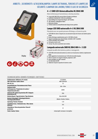 WWW.BRENNENSTUHL.COM 81ARBEITS-, SICHERHEITS- & TASCHENLAMPEN /LAMPE DE TRAVAIL, TORCHES ET LAMPES DE S%u00c9CURIT%u00c9/LAMPADE DA LAVORO, TORCE E LUCI DI SICUREZZA4 + 3 SMD LED-Universalleuchte HL DB43 MHHohe Lichtleistung im Taschenformat, vielseitig einsetzbar.%u25a0 4 super helle SMD-LEDs vorne mit %u00fcber 6 Stunden Leuchtdauer.%u25a0 Zus%u00e4tzliche Schaltstufe f%u00fcr 3 LEDs im Leuchtenkopf.%u25a0 Kunststoffb%u00fcgel mit integriertem Magnet, 360%u00b0 knickbar.%u25a0 360%u00b0 drehbarer, einklappbarer Haken.%u25a0 Mit Ein/Aus Schalter.%u25a0 10 St%u00fcck werden im verkaufsf%u00f6rdernden Display-Karton geliefert.Lampe LED SMD universelle 4+3 HL DB43 MHPolyvalente avec une grande puissance d%u2019%u00e9clairage, en format de poche.%u25a0 4 LED SMD tr%u00e8s claires en fa%u00e7ade avec une autonomie de plus de 6 heures avec batteries pleine charge.%u25a0 Niveau d%u2019%u00e9clairage compl%u00e9mentaire par les 3 LED SMD en frontal.%u25a0 Support en plastique avec aimant int%u00e9gr%u00e9, orientable %u00e0 360%u00b0 et repliable.%u25a0 Crochet orientable %u00e0 360%u00b0 repliable.%u25a0 Interrupteur marche-arr%u00eat.%u25a0 Livr%u00e9 par 10 p. dans un pr%u00e9sentoir auto-vendeur.Lampada universale SMD HL DB43 MH 4 + 3 LEDLampada tascabile ultra luminosa, pratica e maneggevole.%u25a0 4 LED SMD ad alta luminosit%u00e0 anteriori con oltre 6 ore di autonomia a batteria completamente carica.%u25a0 Stadio aggiuntivo di commutazione per 3 LED nella testa della lampada.%u25a0 Manico in plastica con magnete integrato, pieghevole a 360%u00b0.%u25a0 Gancio retraibile e con 360%u00b0 rotazione.%u25a0 Con interruttore On/Off.%u25a0 Imballo da 10 pezzi in espositore di cartone a colori.360%u00b0 MAX.24h BATTERYINCLUSIVE+20LUMEN200TECHNISCHE DATEN / DONN%u00c9ES TECHNIQUES / DATI TECNICIArtikelnummer/ R%u00e9f%u00e9rence / N%u00b0 articolo 1175420010EAN/ Code-barre / Codice a Barre 4007123641628VPE/ UC/ U.I. 10Gesamtlichtstrom/ Flux lumineux total/ Flusso luminoso totale 200 + 20 lmFarbtemperatur/ Temp%u00e9rature de couleur/ Temperatura del colore 6500 KSchutzart (IP)/ Indice de protection (IP)/ Categoria di protezione (IP) IP20Batterie Bauart/ Type de batterie / Tipo di batteria Micro AAA LR03Batterie Technologie / Technologie batterie / Tecnologia della batteria Alkaline/ Alcaline/ AlcalinaSpannung / Tension / Tensione 1.5 VLeuchtdauer max./ Autonomie max./ Max. durata della luce 24 hSchutzklasse / Classe de protection / Classe di protezione IIIFarbe / Couleur/ Colore schwarz/gelb/ noir/jaune/ nero/gialloaDisplay