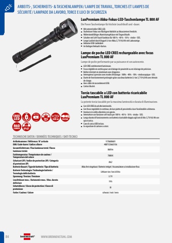 84 WWW.BRENNENSTUHL.COMARBEITS-, SICHERHEITS- & TASCHENLAMPEN /LAMPE DE TRAVAIL, TORCHES ET LAMPES DE S%u00c9CURIT%u00c9/LAMPADE DA LAVORO, TORCE E LUCI DI SICUREZZALuxPremium Akku-Fokus-LED-Taschenlampe TL 800 AFDie Power Taschenlampe f%u00fcr h%u00f6chste Leuchtkraft und -dauer.%u25a0 Mit extrem heller CREE-LED.%u25a0 Stufenloser Fokus von fl%u00e4chigem Nahlicht zu fokussiertem Fernlicht.%u25a0 Widerstandsf%u00e4higes Aluminiumgeh%u00e4use mit Trageschlaufe.%u25a0 Schalter mit Soft-Touch Funktion f%u00fcr 100 % - 40 % - 10 % - strobe - SOS.%u25a0 Lange Laufzeit durch Doppel Li-Ion-Akku 3,7 V/4,0 Ah mit Ladeanzeige.%u25a0 Inklusive USB-Ladekabel.%u25a0 Im farbigen Verkaufs-Karton.Lampe de poche LED CREE rechargeable avec focus LuxPremium TL 800 AFLampe de poche performante par sa puissance et son autonomie.%u25a0 LED CREE extr%u00eamement lumineuse.%u25a0 Focus r%u00e9glable en continu pour un %u00e9clairage de proximit%u00e9 ou en %u00e9clairage de pr%u00e9cision.%u25a0 Bo%u00eetier r%u00e9sistant en aluminium avec dragonne.%u25a0 Interrupteur %u00e0 pression avec modes d%u2019%u00e9clairage : 100% - 40% - 10% - stroboscopique - SOS.%u25a0 Dur%u00e9e de fonctionnement prolong%u00e9e gr%u00e2ce aux deux batteries Li-Ion 3,7 V/4,0 Ah avec t%u00e9moin de charge.%u25a0 Avec c%u00e2ble de raccordement USB.%u25a0 Carton illustr%u00e9.Torcia tascabile a LED con batteria ricaricabile LuxPremium TL 800 AFLa potente torcia tascabile per la massima luminosit%u00e0 e durata di illuminazione.%u25a0 Con LED CREE da ad alta luminosit%u00e0.%u25a0 Con focus regolabile in continuo, da luce piatta di prossimit%u00e0 a luce focalizzabile a distanza.%u25a0 Involucro in solido alluminio con gancio.%u25a0 Interruttore con funzione soft touch per 100 % - 40 % - 10 % - strobo - SOS.%u25a0 Lunga durata di funzionamento con batteria ricaricabile doppia agli ioni di litio 3,7 V/4,0 Ah con spia ricarica.%u25a0 Cavo di carica USB incluso.%u25a0 In espositore di cartone a colori.CREELED USB RECHARGEABLELi-IonINCLUSIVE MAX.19h 320m FOCUS860LUMEN IP67TECHNISCHE DATEN / DONN%u00c9ES TECHNIQUES / DATI TECNICIArtikelnummer/ R%u00e9f%u00e9rence / N%u00b0 articolo 1178600601EAN/ Code-barre / Codice a Barre 4007123663156Gesamtlichtstrom/ Flux lumineux total/ Flusso luminoso totale 860 lmFarbtemperatur/ Temp%u00e9rature de couleur/ Temperatura del colore 7000 KSchutzart (IP)/ Indice de protection (IP)/ Categoria di protezione (IP) IP67Batterie Bauart/ Type de batterie / Tipo di batteria Akku fest eingebaut/ Batterie int%u00e9gr%u00e9/ Accumulatore a installazione fissaBatterie Technologie / Technologie batterie / Tecnologia della batteria Lithium-Ion / Ioni di litioSpannung / Tension / Tensione 3.7 VLeuchtdauer max./ Autonomie max./ Max. durata della luce 19 hSchutzklasse / Classe de protection / Classe di protezione IIIFarbe / Couleur/ Colore schwarz/ noir/ nero