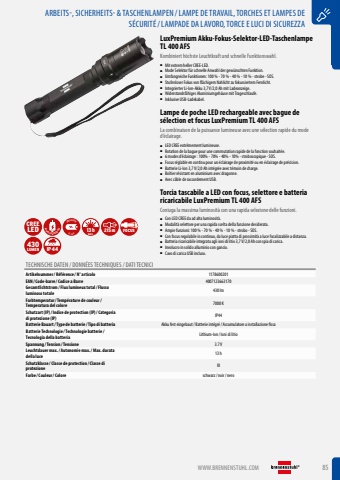 WWW.BRENNENSTUHL.COM 85ARBEITS-, SICHERHEITS- & TASCHENLAMPEN /LAMPE DE TRAVAIL, TORCHES ET LAMPES DE S%u00c9CURIT%u00c9/LAMPADE DA LAVORO, TORCE E LUCI DI SICUREZZALuxPremium Akku-Fokus-Selektor-LED-Taschenlampe TL 400 AFSKombiniert h%u00f6chste Leuchtkraft und schnelle Funktionswahl.%u25a0 Mit extrem heller CREE-LED.%u25a0 Mode Selektor f%u00fcr schnelle Anwahl der gew%u00fcnschten Funktion.%u25a0 Umfangreiche Funktionen: 100 % - 70 % - 40 % - 10 % - strobe - SOS.%u25a0 Stufenloser Fokus von fl%u00e4chigem Nahlicht zu fokussiertem Fernlicht.%u25a0 Integrierter Li-Ion-Akku 3,7 V/2,0 Ah mit Ladeanzeige.%u25a0 Widerstandsf%u00e4higes Aluminiumgeh%u00e4use mit Trageschlaufe.%u25a0 Inklusive USB-Ladekabel.Lampe de poche LED rechargeable avec bague de s%u00e9lection et focus LuxPremium TL 400 AFSLa combinaison de la puissance lumineuse avec une s%u00e9lection rapide du mode d%u2019%u00e9clairage.%u25a0 LED CREE extr%u00eamement lumineuse.%u25a0 Rotation de la bague pour une commutation rapide de la fonction souhait%u00e9e.%u25a0 6 modes d%u2019%u00e9clairage : 100% - 70% - 40% - 10% - stroboscopique - SOS.%u25a0 Focus r%u00e9glable en continu pour un %u00e9clairage de proximit%u00e9 ou en %u00e9clairage de pr%u00e9cision.%u25a0 Batterie Li-Ion 3,7 V/2,0 Ah int%u00e9gr%u00e9e avec t%u00e9moin de charge.%u25a0 Bo%u00eetier r%u00e9sistant en aluminium avec dragonne.%u25a0 Avec c%u00e2ble de raccordement USB.Torcia tascabile a LED con focus, selettore e batteria ricaricabile LuxPremium TL 400 AFSConiuga la massima luminosit%u00e0 con una rapida selezione delle funzioni.%u25a0 Con LED CREE da ad alta luminosit%u00e0.%u25a0 Modalit%u00e0 selettore per una rapida scelta della funzione desiderata.%u25a0 Ampie funzioni: 100 % - 70 % - 40 % - 10 % - strobo - SOS.%u25a0 Con focus regolabile in continuo, da luce piatta di prossimit%u00e0 a luce focalizzabile a distanza.%u25a0 Batteria ricaricabile integrata agli ioni di litio 3,7 V/2,0 Ah con spia di carica.%u25a0 Involucro in solido alluminio con gancio.%u25a0 Cavo di carica USB incluso.CREELED USB RECHARGEABLELi-IonINCLUSIVE MAX.13h 215m FOCUS430LUMEN IP44TECHNISCHE DATEN / DONN%u00c9ES TECHNIQUES / DATI TECNICIArtikelnummer/ R%u00e9f%u00e9rence / N%u00b0 articolo 1178600201EAN/ Code-barre / Codice a Barre 4007123663170Gesamtlichtstrom/ Flux lumineux total/ Flusso luminoso totale 430 lmFarbtemperatur/ Temp%u00e9rature de couleur/ Temperatura del colore 7000 KSchutzart (IP)/ Indice de protection (IP)/ Categoria di protezione (IP) IP44Batterie Bauart/ Type de batterie / Tipo di batteria Akku fest eingebaut/ Batterie int%u00e9gr%u00e9/ Accumulatore a installazione fissaBatterie Technologie / Technologie batterie / Tecnologia della batteria Lithium-Ion / Ioni di litioSpannung / Tension / Tensione 3.7 VLeuchtdauer max./ Autonomie max./ Max. durata della luce 13 hSchutzklasse / Classe de protection / Classe di protezione IIIFarbe / Couleur/ Colore schwarz/ noir/ nero