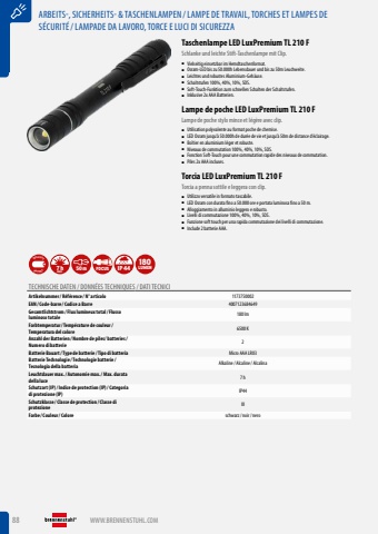 88 WWW.BRENNENSTUHL.COMARBEITS-, SICHERHEITS- & TASCHENLAMPEN /LAMPE DE TRAVAIL, TORCHES ET LAMPES DE S%u00c9CURIT%u00c9/LAMPADE DA LAVORO, TORCE E LUCI DI SICUREZZATaschenlampe LED LuxPremium TL 210 FSchlanke und leichte Stift-Taschenlampe mit Clip.%u25a0 Vielseitig einsetzbar im Hemdtaschenformat.%u25a0 Osram-LED bis zu 50.000h Lebensdauer und bis zu 50m Leuchweite.%u25a0 Leichtes und robustes Aluminium-Geh%u00e4use.%u25a0 Schaltstufen 100%, 40%, 10%, SOS.%u25a0 Soft-Touch-Funktion zum schnellen Schalten der Schaltstufen.%u25a0 Inklusive 2x AAA Batterien.Lampe de poche LED LuxPremium TL 210 FLampe de poche stylo mince et l%u00e9g%u00e8re avec clip.%u25a0 Utilisation polyvalente au format poche de chemise.%u25a0 LED Osram jusqu%u2019%u00e0 50.000h de dur%u00e9e de vie et jusqu%u2019%u00e0 50m de distance d%u2019%u00e9clairage.%u25a0 Bo%u00eetier en aluminium l%u00e9ger et robuste.%u25a0 Niveaux de commutation 100%, 40%, 10%, SOS.%u25a0 Fonction Soft-Touch pour une commutation rapide des niveaux de commutation.%u25a0 Piles 2x AAA incluses.Torcia LED LuxPremium TL 210 FTorcia a penna sottile e leggera con clip.%u25a0 Utilizzo versatile in formato tascabile.%u25a0 LED Osram con durata fino a 50.000 ore e portata luminosa fino a 50 m.%u25a0 Alloggiamento in alluminio leggero e robusto.%u25a0 Livelli di commutazione 100%, 40%, 10%, SOS.%u25a0 Funzione soft touch per una rapida commutazione dei livelli di commutazione.%u25a0 Include 2 batterie AAA.BATTERYINCLUSIVE MAX.7h 50m FOCUS IP44180LUMENTECHNISCHE DATEN / DONN%u00c9ES TECHNIQUES / DATI TECNICIArtikelnummer/ R%u00e9f%u00e9rence / N%u00b0 articolo 1173750002EAN/ Code-barre / Codice a Barre 4007123684649Gesamtlichtstrom/ Flux lumineux total/ Flusso luminoso totale 180 lmFarbtemperatur/ Temp%u00e9rature de couleur/ Temperatura del colore 6500 KAnzahl der Batterien / Nombre de piles/ batteries/ Numero di batterie 2Batterie Bauart/ Type de batterie / Tipo di batteria Micro AAA LR03Batterie Technologie / Technologie batterie / Tecnologia della batteria Alkaline/ Alcaline/ AlcalinaLeuchtdauer max./ Autonomie max./ Max. durata della luce 7 hSchutzart (IP)/ Indice de protection (IP)/ Categoria di protezione (IP) IP44Schutzklasse / Classe de protection / Classe di protezione IIIFarbe / Couleur/ Colore schwarz/ noir/ nero