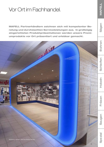 11MAFELLS%u00e4genSchleifenHobelnFr%u00e4senSaugenSpezialBohrenMAFELL Partnerh%u00e4ndlern zeichnen sich mit kompetenter Beratung und durchdachten Serviceleistungen aus. In gro%u00dfz%u00fcgig eingerichteten Produktpr%u00e4sentationen werden unsere Premiumprodukte vor Ort pr%u00e4sentiert und erlebbar gemacht.Vor Ort im Fachhandel.Abbildung: MAFELL Welt bei Partner-H%u00e4ndler