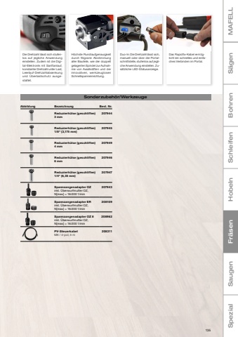 41MAFELLS%u00e4genSchleifenHobelnFr%u00e4senSaugenSpezialBohrenSonderzubeh%u00f6r/WerkzeugeAuch auf anderen Schienensystemen l%u00e4sst sich die MT 55 cc problemlos einsetzen.Der schnellste S%u00e4geblattwechsel der Welt: Einfach Entriegelungsk nopf dr%u00fcck en und Hebel anheben. Das Geh%u00e4use %u00f6ffnet sich und das S%u00e4geblatt k ann im Handumdrehen gewechselt werden.Mit oder ohne Schiene %u2013 durch einfaches Drehen des Schnitttiefenzeigers wird immer die exak te Schnitttiefe angezeigt.Hier zeichnet sich die MT 55 cc aus: hochpr%u00e4zise Tauchschnitte z. B. in K%u00fcchenarbeitsplatten.AbbildungBezeichnungBest. Nr.F%u00fchrungsschienenF 80, 0,8 m langF 110, 1,1 m langF 160, 1,6 m langF 210, 2,1 m langF 310, 3,1 m lang204380204381204365204382204383Verbindungsst%u00fcck F-VSzum Verbinden zweier F%u00fchrungsschienen204363Winkelanschlag F-WA205357Saug-Spann-System Aerofix F-AF 1mit 1,3 m Schiene, Adapter f%u00fcr oben und unten, Flexschlauch204770Flexschlauch FXS-Lbis L%u00e4nge 3,2 m205276F%u00fchrungsschienentasche F 160f%u00fcr F%u00fchrungsschienen bis 1,6 m L%u00e4ngeF%u00fchrungsschienen -taschen-Set:2 x F 160 + F-VS + 2 x F-SZ 180MM+ F%u00fchrungsschienentascheF%u00fchrungsschienentaschen-Set:F 80 + F 160 + F-WA + F-VS + 2 x F-SZ 180 MM+ F%u00fchrungsschienentasche204626204805204749Endkappen F-EK2 St%u00fcck205400Haftprofil F-HP 6,8M6,8 m lang204376Spanrei%u00dfschutz F-SS 3,4M3,4 m lang204375Spannzwinge F-SZ 180MM2 St%u00fcck, zur Schienenfixierung am Werkst%u00fcck207770Positionsanzeiger MT-PA205398AbbildungBezeichnungBest. Nr.R%u00fcckschlagstopp F-RS202867Parallelanschlagmit Fl%u00fcgelschrauben203214Untergreifanschlag MF-UA206073S%u00e4geblatt-HM160 x 1,2/1,8 x 20 mm, Z 16, WZ, f%u00fcr L%u00e4ngsschnitte in Holz S%u00e4geblatt-HM160 x 1,2/1,8 x 20 mm, Z 24, WZ, f%u00fcr universellen Einsatz in Holz092539092533S%u00e4geblatt-HM160 x 1,2/1,8 x 20 mm, Z 32,WZ, f%u00fcr Feinschnitte in HolzS%u00e4geblatt-HM162 x 1,2/1,8 x 20 mm, Z 48, WZ, f%u00fcr universellen Einsatz in Plattenwerkstoffen092552092584S%u00e4geblatt-HM160 x 1,2/1,8 x 20 mm,Z 48, FZ/TR, f%u00fcr Schichtstoffplatten (Trespa) S%u00e4geblatt-HM160 x 1,2/1,8 x 20 mm, Z 56,FZ/TR, f%u00fcr Feinschnitte in Holz092569092553S%u00e4geblatt-Diamant160 x 2,4/3,0 x 20 mm, Z 4,FZ/TR, f%u00fcr zementgebundene Werkstoffe092474Sp%u00e4nebeutel206921