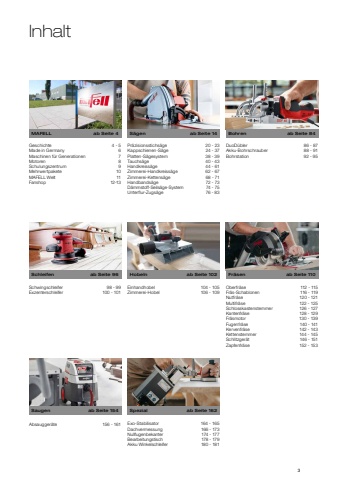 3DuoD%u00fcbler86 - 87Akku-Bohrschrauber88 - 91Bohrstation92 - 95Oberfr%u00e4se112 - 115Fr%u00e4s-Schablonen116 - 119Nutfr%u00e4se120 - 121Multifr%u00e4se122 - 125Schlosskastenstemmer126 - 127Kantenfr%u00e4se128 - 129Fr%u00e4smotor130 - 139Fugenfr%u00e4se140 - 141Kervenfr%u00e4se142 - 143Kettenstemmer144 - 145Schlitzger%u00e4t146 - 151Zapfenfr%u00e4se152 - 153Pr%u00e4zisionsstichs%u00e4ge20 - 23Kappschienen-S%u00e4ge24 - 37Platten-S%u00e4gesystem38 - 39Tauchs%u00e4ge40 - 43Handkreiss%u00e4ge44 - 61Zimmerei-Handkreiss%u00e4ge62 - 67Zimmerei-Kettens%u00e4ge68 - 71 Handbands%u00e4ge72 - 73D%u00e4mmstoff-Seils%u00e4ge-System74 - 75Unterflur-Zugs%u00e4ge76 - 83Einhandhobel104 - 105Zimmerei-Hobel106 - 109Geschichte4 - 5Made in Germany6Maschinen f%u00fcr Generationen7Motoren8Schulungszentrum9Mehrwertpakete10MAFELL Welt11Fanshop12-13Schwingschleifer98 - 99Exzenterschleifer100 - 101Absaugger%u00e4te156 - 161MAFELLab Seite 4Schleifenab Seite 96Saugenab Seite 154S%u00e4genab Seite 14Hobelnab Seite 102Exo-Stabilisator164 - 165Dachvermessung166 - 173Nullfugenbekanter174 - 177Bearbeitungstisch178 - 179Akku Winkelschleifer180 - 181Spezialab Seite 162Bohrenab Seite 84Fr%u00e4senab Seite 110Inhalt