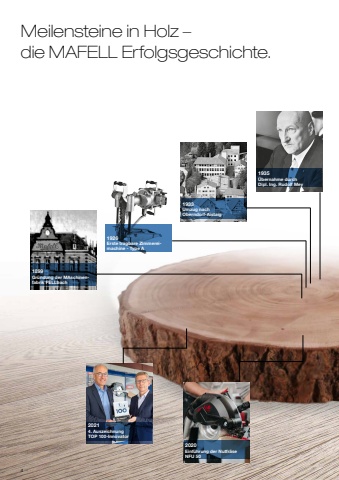 41926Erste tragbare Zimmereimachine - Type A1899Gr%u00fcndung der MAschinenfabrik FELLbach1933Umzug nachOberndorf-Aistaig1935%u00dcbernahme durch Dipl. Ing. Rudolf Mey2020Einf%u00fchrung der Nutfr%u00e4seNFU 50Meilensteine in Holz %u2013die MAFELL Erfolgsgeschichte.2021 4. Auszeichnung TOP 100-Innovator