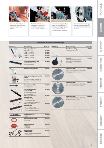 29MAFELLS%u00e4genSchleifenHobelnFr%u00e4senSaugenSpezialBohrenSonderzubeh%u00f6r/WerkzeugeAbbildungBezeichnungBest. Nr.F%u00fchrungsschienenF 80, 0,8 m langF 110, 1,1 m langF 160, 1,6 m langF 210, 2,1 m langF 310, 3,1 m lang204380204381204365204382204383Verbindungsst%u00fcck F-VSzum Verbinden zweier F%u00fchrungsschienen204363Winkelanschlag F-WA205357Saug-Spann-System Aerofix F-AF 1mit 1,3 m Schiene, Adapter f%u00fcr oben und unten, Flexschlauch204770Flexschlauch FXS-Lbis L%u00e4nge 3,2 m205276F%u00fchrungsschienentasche F 160f%u00fcr F%u00fchrungsschienen bis 1,6 m L%u00e4ngeF%u00fchrungsschienen -taschen-Set:2 x F 160 + F-VS + 2 x F-SZ 180 MM+ F%u00fchrungsschienentascheF%u00fchrungsschienentaschen-Set:F 80 + F 160 + F-WA + F-VS + 2 x F-SZ 180 MM+ F%u00fchrungsschienentasche204626209591209592Endkappen F-EK2 St%u00fcck205400Haftprofil F-HP 6,8M6,8 m lang204376Spanrei%u00dfschutz F-SS 3,4M3,4 m lang204375Spannzwinge F-SZ 180MM2 St%u00fcck, zur Schienenfixierung am Werkst%u00fcck207770AbbildungBezeichnungBest. Nr.Transportkoffermit Einlage204240F%u00fchrungseinrichtung Mmaximale Schnittl%u00e4nge 400 mmF%u00fchrungseinrichtung MLmaximale Schnittl%u00e4nge 770 mm208170204378Parallelanschlag K 55-PAmit Fl%u00fcgelschrauben206825Untergreifanschlag MF-UA206073S%u00e4geblatt-HM168 x 1,2/1,8 x 20 mm, Z 16, WZ, f%u00fcr L%u00e4ngsschnitte in HolzS%u00e4geblatt-HM168 x 1,2/1,8 x 20 mm, Z 24, WZ, f%u00fcr universellen Einsatz in Holz092476092478S%u00e4geblatt-HM168 x 1,2/1,8 x 20 mm, Z 32, WZ, f%u00fcr Feinschnitte in HolzS%u00e4geblatt-HM168 x 1,2/1,8 x 20 mm, Z 56, WZ, f%u00fcr Querschnitte in Holz092480092482Sp%u00e4nebeutel206921Durch die gro%u00dfe Skaleneinteilung ist die Winkeleinstellung extrem pr%u00e4zise.Der fixe und der einstellbare Anschlag an der Unterseite der Schiene sorgen daf%u00fcr, dass das System f%u00fcr Winkelschnitte von + 60%u00b0 bis - 60%u00b0 eingesetzt werden kann.Dank gro%u00dfdimensionierter Winkelskala lassen sich Gehrungsschnitte passgenau umsetzen. Wie hier am Beispiel einer Fassadenschalung.Alles aus einer Hand: Bei der KappschienenS%u00e4ge sind Maschine und F%u00fchrungsschiene fest miteinander verbunden.