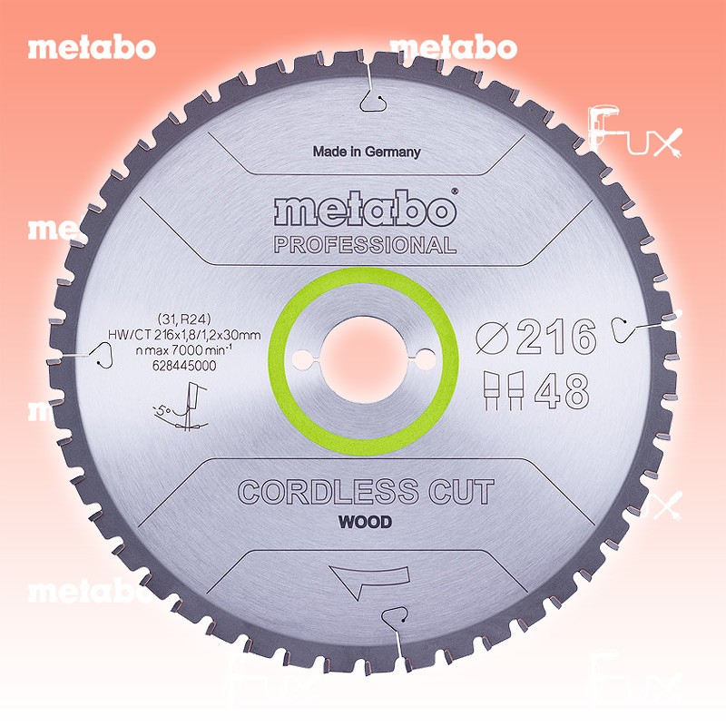 Zu "Kreissägeblätter »cordless cut« wood " von Metabo Metabo Kreissägeblatt 216 mm professional Bestell- und Artikelnummer: 628445000 Maximale Laufzeit für Akku-Sägen durch extra dünne Stammblattdicke und Schnittbreite Deutlich mehr Schnitte pro Akkuladung im Vergleich zu Standard-Sägeblättern bei gleich hoher Standzeit Besonders hohe Standzeit durch beste Hartmetallqualität und feingeschliffene Zähne Präzise, geräuscharme und vibrationsminimierte Schnitte durch gelaserte Dehnschlitze (und teilweise Laserornamente), sowie gelaserte Stammblätter aus hochwertigstem Stahl Zum Kreissägeblatt-Finder Technische Daten Durchmesser x Schnittbreite x Bohrung 216 x 1.8 x 30 mm Material HW/CT Zähnezahl 48 Zahnform WZ Stammblattdicke 1.2 mm Spanwinkel 5° neg. geeignet für KS 18 LTX 216 / KGS 18 LTX 216 Verpackung Karton Standard-Ausrüstung Verkaufseinheit 1 Stk. Geliefert im Karton Listenpreis CHF 112.00 Fuxpreis CHF 95.00 inkl. 8.1% MwSt, inkl vRG Versand CHF 15.00 Kein Grauimport! Produkt bestellen Verkaufseinheit 1 Stk. 1 Stück 2 Stück 3 Stück 4 Stück 5 Stück 6 Stück 7 Stück 8 Stück 9 Stück 10 Stück 11 Stück 12 Stück 13 Stück 14 Stück 15 Stück 16 Stück 17 Stück 18 Stück 19 Stück 20 Stück 21 Stück 22 Stück 23 Stück 24 Stück 25 Stück 26 Stück 27 Stück 28 Stück 29 Stück 30 Stück 31 Stück 32 Stück 33 Stück 34 Stück 35 Stück 36 Stück 37 Stück 38 Stück 39 Stück 40 Stück 41 Stück 42 Stück 43 Stück 44 Stück 45 Stück 46 Stück 47 Stück 48 Stück 49 Stück 50 Stück Alle Angaben ohne Gewähr und solange Vorrat reicht!Wiederverkäufer werden?Lehrlingsrabatt? Produkt als PDF AKTION 15%