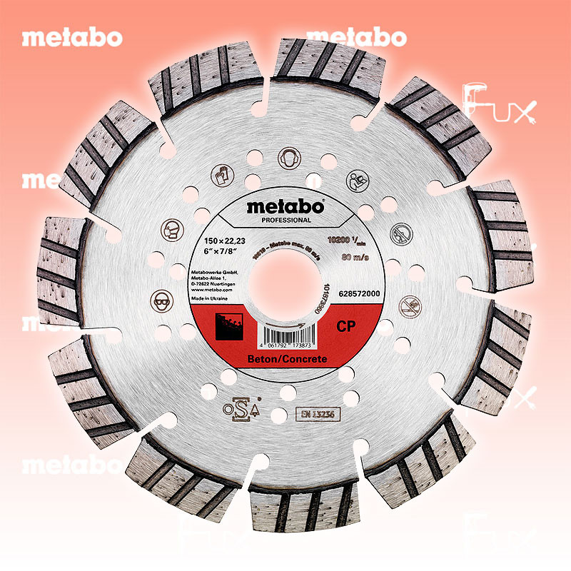 Zu "Qualitätsklasse »professional« / CP " von Metabo Metabo Diamanttrennscheibe 150 mm Bestell- und Artikelnummer: 628572000 Ideal für alle harten Materialien, wie Beton (auch armiert), Betonrohre, Bordsteine, harte Sandsteine, Verbundsteine, Waschbeton Hochwertige Diamantqualität und hochwertige Rohstoffe für optimale Schnittleistung und hohe Standzeit Spezielle Turbosegmente für sehr hohe Schnittgeschwindigkeit in nahezu allen Materialien Laserverschweißte Diamantsegmente; Segmenthöhe: 12 mm Technische Daten Durchmesser x Bohrung 150 x 22.23 mm Segmentabmessungen 33 x 2,4 x 12 Segmentanzahl 10 Max. Drehzahl 10200 /min Standard-Ausrüstung Verkaufseinheit 1 Stk. Listenpreis CHF 64.00 Fuxpreis CHF 54.00 inkl. 8.1% MwSt, inkl vRG Versand CHF 15.00 Kein Grauimport! Produkt bestellen Verkaufseinheit 1 Stk. 1 Stück 2 Stück 3 Stück 4 Stück 5 Stück 6 Stück 7 Stück 8 Stück 9 Stück 10 Stück 11 Stück 12 Stück 13 Stück 14 Stück 15 Stück 16 Stück 17 Stück 18 Stück 19 Stück 20 Stück 21 Stück 22 Stück 23 Stück 24 Stück 25 Stück 26 Stück 27 Stück 28 Stück 29 Stück 30 Stück 31 Stück 32 Stück 33 Stück 34 Stück 35 Stück 36 Stück 37 Stück 38 Stück 39 Stück 40 Stück 41 Stück 42 Stück 43 Stück 44 Stück 45 Stück 46 Stück 47 Stück 48 Stück 49 Stück 50 Stück Alle Angaben ohne Gewähr und solange Vorrat reicht!Wiederverkäufer werden?Lehrlingsrabatt? Produkt als PDF AKTION 15%