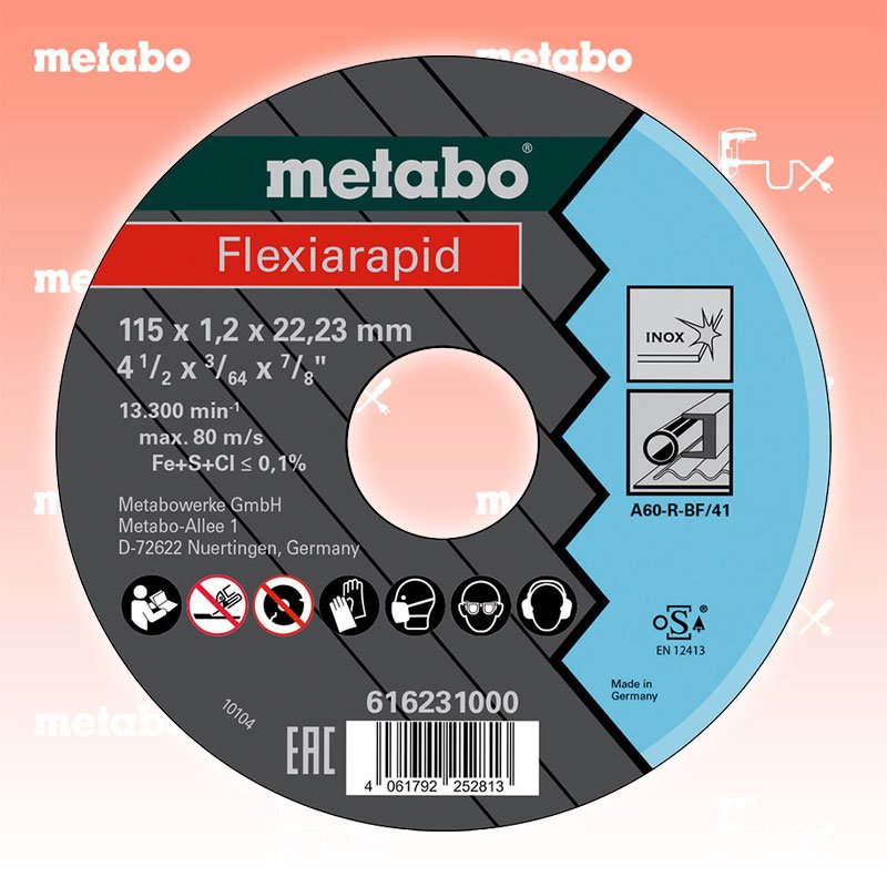 Zu "Qualitätsklasse A 60-R / A 46-R / A 30-R Trennscheiben" von Metabo Metabo Metabo Trennscheibe Stahl 115 mm Bestell- und Artikelnummer: 616231000 Dünne Hochleistungsscheibe speziell für rostfreie, dünnwandige Materialien wie z. B. Rohre, Bleche, Profile, Drähte Härte: hart Sehr hohe Schnittleistung bei hoher Standzeit durch Verwendung von Spezialkorunden Geringer Materialverbrauch, kraftsparend, geringe Maschinenbelastung Eisen-, schwefel- und chlorfrei (Fe + S + Cl ≤ 0,1 %) Arbeitshöchstgeschwindigkeit 80 m/s A 60-R bei 1 mm Stärke; A 46-R bei 1,6 mm Stärke; A 30-R bei 1,9 mm Stärke Technische Daten Qualitätsklasse A 60-R Durchmesser x Dicke x Bohrung 115 x 1.2 x 22.23 mm Ausführung gerade Max. Drehzahl 13300 /min Standard-Ausrüstung Verkaufseinheit 25 Stk. Listenpreis CHF 87.50 Fuxpreis CHF 74.00 inkl. 8.1% MwSt, inkl vRG Versand CHF 15.00 Kein Grauimport! Produkt bestellen Verkaufseinheit 25 Stk. 1 Stück 2 Stück 3 Stück 4 Stück 5 Stück 6 Stück 7 Stück 8 Stück 9 Stück 10 Stück 11 Stück 12 Stück 13 Stück 14 Stück 15 Stück 16 Stück 17 Stück 18 Stück 19 Stück 20 Stück 21 Stück 22 Stück 23 Stück 24 Stück 25 Stück 26 Stück 27 Stück 28 Stück 29 Stück 30 Stück 31 Stück 32 Stück 33 Stück 34 Stück 35 Stück 36 Stück 37 Stück 38 Stück 39 Stück 40 Stück 41 Stück 42 Stück 43 Stück 44 Stück 45 Stück 46 Stück 47 Stück 48 Stück 49 Stück 50 Stück Alle Angaben ohne Gewähr und solange Vorrat reicht!Wiederverkäufer werden?Lehrlingsrabatt? Produkt als PDF AKTION 15%