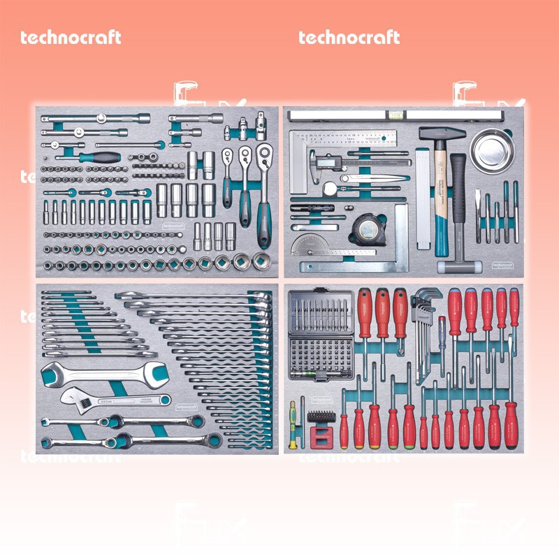 Hochwertiger Werkstattwagen bestückt mit 428 ausgewählten Werkzeugen und 315 Verbrauchsteilen. Die 7 Einlagen sind CNC-gefräste Schaumstoffeinlagen mit Kunststoffabdeckung im edlen Metall-Finish und bieten jedem Werkzeug seinen Platz und sicheren Halt. Der Werkstattwagen verfügt zusätzlich über eine achte Schublade die individuell genutzt werden kann.