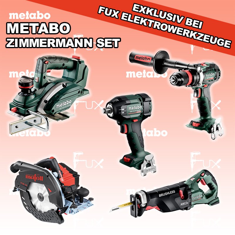 Heute auf dieses Produkt 21% Rabatt! Zu "Zimmermann Set" von Metabo FULL Service: 36 Monate zum Nulltarif für Sie! Weitere Infos zum FULL Service Dieses Produkt ist CAS kompatibel! Weitere Infos zu CAS Sparfux Aktionen FUX SPECIAL EXKLUSIV BEI FUX Metabo Zimmermann SET 7 SOLO Bestell- und Artikelnummer: Zimmermann SET 7 SOLO BS 18 LTX BL Q I Akku-BohrschrauberAkkuspannung 18 V Drehzahl 0-550 / 0-2000 U/min Drehmoment hart / weich 130 / 65 Nm Gewicht (mit Akkupack) 2.3 kgInfos SSW 18 LTX 550 BL Akku-SchlagschrauberAkkuspannung 18 V Anziehdrehmoment 550 Nm Werkzeugaufnahme 1/2" Gewicht ohne Akkupack 1,4 kgInfos SSEP 18 LTX BL MVT Akku-SäbelsägeAkkuspannung 18 V Hubzahl bei Leerlauf 0 - 3.000 /min Gewicht (mit Akkupack) 4.6 kgInfos HO 18 LTX 20-82 Akku-Einhand-HobelAkkuspannung 18 V Hobelbreite 82 mm Spanabnahme einstellbar 0-2 mm Gewicht 3.5 KgInfos K 85 - 18 PURE Akku-Handkreissägen im L-MAXSchnitttiefe 0 – 88 mm Schnitttiefe bei 45° 0 – 61.5 mm Gewicht (mit Akku) 8.1 kgInfos Registriere die in diesem Set vorhandenen Metabo Maschinen auf metabo.ch, und ergattere dir bis zu 5 Gratis Akkus!Zusätzlich offerieren wir zu diesem Set einen Gratis Akku!OHNE AKKUS UND LADEGERÄT Standard-Ausrüstung In diesem Set enthalten: BS 18 LTX BL Q I Akku-Bohrschrauber SSW 18 LTX 550 BL Akku-Schlagschrauber SSEP 18 LTX BL MVT Akku-Säbelsäge HO 18 LTX 20-82 Akku-Einhand-Hobel K 85 - 18 PURE Akku-Handkreissägen im L-MAX Listenpreis CHF 2'582.20 Fuxpreis CHF 2'040.00 inkl. 8.1% MwSt, inkl vRG Versand CHF 25.00 Kein Grauimport! Produkt bestellen 1 Stück 2 Stück 3 Stück 4 Stück 5 Stück 6 Stück 7 Stück 8 Stück 9 Stück 10 Stück Alle Angaben ohne Gewähr und solange Vorrat reicht!Wiederverkäufer werden? Produkt als PDF NEUHEITAKTION 21%