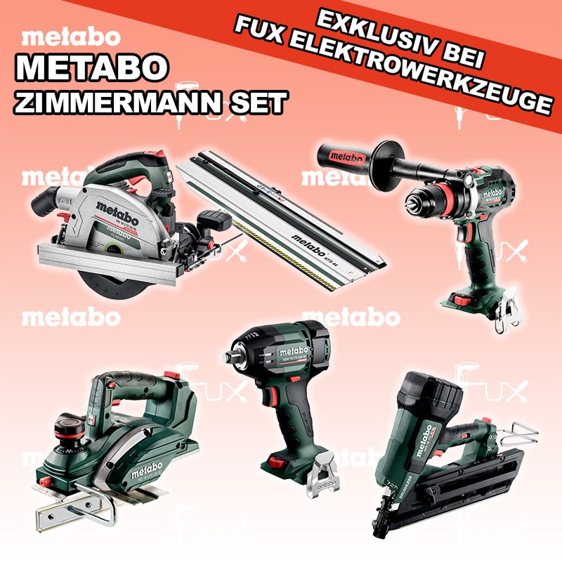Heute auf dieses Produkt 27% Rabatt! Zu "Zimmermann Set" von Metabo FULL Service: 36 Monate zum Nulltarif für Sie! Weitere Infos zum FULL Service Dieses Produkt ist CAS kompatibel! Weitere Infos zu CAS Sparfux Aktionen FUX SPECIAL EXKLUSIV BEI FUX Metabo Zimmermann SET 10 SOLO Bestell- und Artikelnummer: Zimmermann SET 10 SOLO BS 18 LTX BL Q I Akku-BohrschrauberAkkuspannung 18 V Drehzahl 0-550 / 0-2000 U/min Drehmoment hart / weich 130 / 65 Nm Gewicht (mit Akkupack) 2.3 kgInfos SSW 18 LTX 550 BL Akku-SchlagschrauberAkkuspannung 18 V Anziehdrehmoment 550 Nm Werkzeugaufnahme 1/2" Gewicht ohne Akkupack 1,4 kgInfos NFR 18 LTX 90 BL Akku NaglerAkkuspannung 18 V Nagelstreifen Winkel 30 - 34 ° Nagellänge 50 - 90 mm Nageldurchmesser 2,9 - 3,3 mm Gewicht ohne Akkupack 4,1 kgInfos HO 18 LTX 20-82 Akku-Einhand-HobelAkkuspannung 18 V Hobelbreite 82 mm Spanabnahme einstellbar 0-2 mm Gewicht 3.5 KgInfos KS 18 LTX 66 BL Akku HandkreissägeAkkuspannung 18 V Schnitt-Tiefe bei 90° 0-66 mm Sägeblatt 165 mm Gewicht 4.5 kgInfos Kappschiene KFS 44Gesamtlänge 834 mm Schnittlänge 440 mmInfos Registriere die in diesem Set vorhandenen Metabo Maschinen auf metabo.ch, und ergattere dir bis zu 5 Gratis Akkus!Zusätzlich offerieren wir zu diesem Set einen Gratis Akku!OHNE AKKUS UND LADEGERÄT Standard-Ausrüstung In diesem Set enthalten: BS 18 LTX BL Q I Akku-Bohrschrauber SSW 18 LTX 550 BL Akku-Schlagschrauber NFR 18 LTX 90 BL Akku Nagler HO 18 LTX 20-82 Akku-Einhand-Hobel KS 18 LTX 66 BL Akku Handkreissäge Kappschiene KFS 44 Listenpreis CHF 2'253.50 Fuxpreis CHF 1'629.00 inkl. 8.1% MwSt, inkl vRG Versand CHF 25.00 Kein Grauimport! Produkt bestellen 1 Stück 2 Stück 3 Stück 4 Stück 5 Stück 6 Stück 7 Stück 8 Stück 9 Stück 10 Stück Alle Angaben ohne Gewähr und solange Vorrat reicht!Wiederverkäufer werden? Produkt als PDF NEUHEITAKTION 27%
