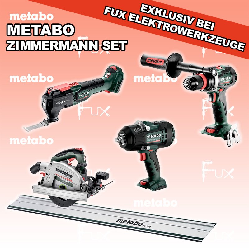 Metabo Zimmermann SET 18 SOLO BS 18 LTX BL Q I Akku-Bohrschrauber MT 18 LTX BL QSL Akku-Multitool SSW 18 LTX 1450 BL Akku-Schlagschrauber KS 18 LTX 66 BL Akku Handkreissäge FS 160 Führungsschiene