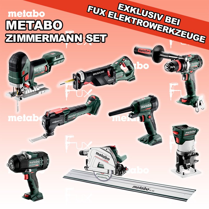 Metabo Zimmermann SET XXL SOLO BS 18 LTX BL Q I Akku-Bohrschrauber STA 18 LTX 150 BL Akku-Stichsäge MT 18 LTX BL QSL Akku-Multitool SSW 18 LTX 1450 BL Akku-Schlagschrauber KS 18 LTX 66 BL Akku Handkreissäge MS 36-18 LTX BL 40 Akku Kettensäge SSEP 18 LTX BL MVT Akku-Säbelsäge BP 18 LTX BL Akku Blaspistole FMV 18 LTX BL 8 Akku Kantenfräse FS 160 Führungsschiene