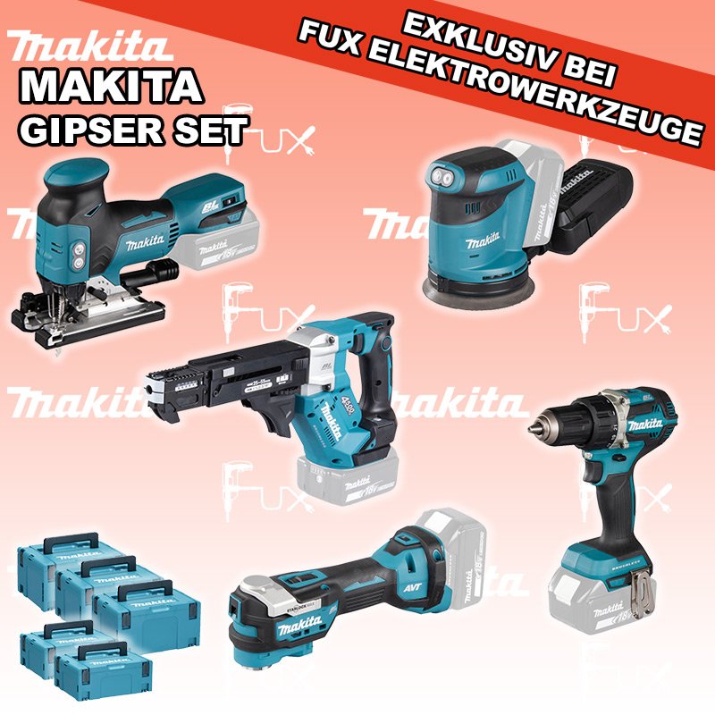Zu "Gipser Set" von Makita FUX SPECIAL EXKLUSIV BEI FUX Makita Gipser Set 2 SOLO Bestell- und Artikelnummer: maGipser Set 2 SOLO DDF484ZJ Akku-BohrschrauberAkkuspannung 18 V Drehzahlen 0-500 / 0-2000 U/min Drehmoment hart / weich 54 / 30 Nm Gewicht 1.5 kgInfos DFR552Z Akku-MagazinschrauberAkkuspannung 18 V Drehzahl 0 - 4500 min⁻¹ Schnellbauschrauben 25 - 55 mm Gewicht inkl. Akku 1.9 - 2.2 kg kgInfos DBO180ZJ Akku-ExzenterschleiferAkkuspannung 18 V Exzenterhub 2,8 mm Schleifteller (Ø) 125 mm Gewicht 3.6 kgInfos DTM52Z Multifunktions WerkzeugAkkuspannung 18 V Schwingungen 10000 - 20000 min-1 Werkzeugaufnahme Starlock Max System Gewicht inkl. Akku 2.0 kg Infos DJV18ZJ Akku-StichsägeAkkuspannung 18 V Hubzahl 800 - 3500/ min Schnittleistung Holz 135 mm / Stahl 10 mm Gewicht 2.5 kgInfos 2 x MAKPAC Gr. 3Produktabmessung (L x B x H) 377 x 277 x 176 mm Infos Einsatz für DFR551 Einsatz für DFR551 Makpac Koffer Typ C (821551-8)Infos Einsatz für DTM52 Einsatz für DTM52 Makpac Koffer Typ C (821551-8) Infos OHNE AKKUS UND LADEGERÄT Standard-Ausrüstung In diesem Set enthalten: DDF484ZJ Akku-Bohrschrauber DFR552Z Akku-Magazinschrauber DBO180ZJ Akku-Exzenterschleifer DTM52Z Multifunktions Werkzeug DJV18ZJ Akku-Stichsäge 2 x MAKPAC Gr. 3 Einsatz für DFR551 Einsatz für DTM52 Geliefert im Koffer Zubehör Listenpreis CHF 1'507.00 Fuxpreis CHF 1'020.00 inkl. 8.1% MwSt, inkl vRG Versand CHF 20.00 Kein Grauimport! Produkt bestellen 1 Stück 2 Stück 3 Stück 4 Stück 5 Stück 6 Stück 7 Stück 8 Stück 9 Stück 10 Stück Option: Makita BL 1860 B ( Li-lon Akku ) für CHF 95.- statt CHF 124.-Infos Alle Angaben ohne Gewähr und solange Vorrat reicht!Wiederverkäufer werden? Produkt als PDF NEUHEITAKTION 32%