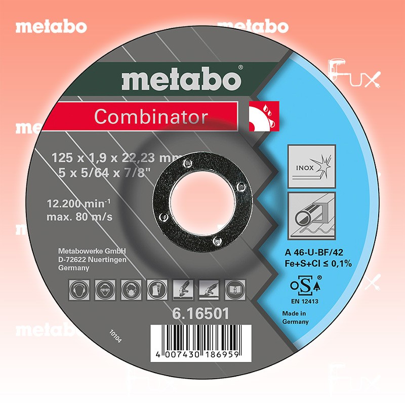 Zu "Qualitätsklasse A 46-U Trennscheiben" von Metabo Metabo Trennscheibe Stahl 125 mm Bestell- und Artikelnummer: 616501000 Eine Schleifscheibe für zwei Anwendungen: Schnelles Trennen, sowie leichtes Entgraten/Schleifen Universell einsetzbar für die Bearbeitung von rostfreien Stählen, als auch für die allgemeine Metallbearbeitung Eisen-, schwefel- und chlorfrei (Fe + S + Cl ≤ 0,1 %) Härte: hart Reduziert Arbeitskosten durch die Einsparung von Rüstzeiten Vermeidet zeitaufwändigen Scheibenwechsel im mobilen Einsatz Höchste Qualitäts- und Sicherheitsstandards durch form- und seitenstabile Scheibenausführung (geprüfte Sicherheit durch 3 vollflächige Gewebelagen) Arbeitshöchstgeschwindigkeit: 80 m/s Technische Daten Qualitätsklasse A 46 U Combinator Inox Durchmesser x Dicke x Bohrung 125 x 1,9 x 22,23 mm Ausführung gekröpft Max. Drehzahl 12200 Standard-Ausrüstung Verkaufseinheit 25 Stk. Listenpreis CHF 137.50 Fuxpreis CHF 117.00 inkl. 8.1% MwSt, inkl vRG Frankolieferung Kein Grauimport! Produkt bestellen Verkaufseinheit 25 Stk. 1 Stück 2 Stück 3 Stück 4 Stück 5 Stück 6 Stück 7 Stück 8 Stück 9 Stück 10 Stück 11 Stück 12 Stück 13 Stück 14 Stück 15 Stück 16 Stück 17 Stück 18 Stück 19 Stück 20 Stück 21 Stück 22 Stück 23 Stück 24 Stück 25 Stück 26 Stück 27 Stück 28 Stück 29 Stück 30 Stück 31 Stück 32 Stück 33 Stück 34 Stück 35 Stück 36 Stück 37 Stück 38 Stück 39 Stück 40 Stück 41 Stück 42 Stück 43 Stück 44 Stück 45 Stück 46 Stück 47 Stück 48 Stück 49 Stück 50 Stück Alle Angaben ohne Gewähr und solange Vorrat reicht!Wiederverkäufer werden?Lehrlingsrabatt? Produkt als PDF AKTION 15%