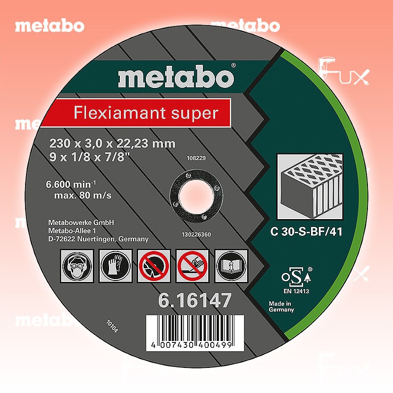 Zu "Qualitätsklasse C 30 S Trennscheiben" von Metabo Metabo Trennscheibe Stein 180 mm Bestell- und Artikelnummer: 616143000 Universalscheibe zur Bearbeitung von Natur und Kunststein Härte: mittel Hohe Schnittleistung bei hoher Standzeit Arbeitshöchstgeschwindigkeit 80 m/s Technische Daten Qualitätsklasse C 30 S Durchmesser x Dicke x Bohrung 180 x 3 x 22,23 mm Ausführung gerade Max. Drehzahl 8500 Standard-Ausrüstung Verkaufseinheit 25 Stk. Listenpreis CHF 112.50 Fuxpreis CHF 96.00 inkl. 8.1% MwSt, inkl vRG Versand CHF 15.00 Kein Grauimport! Produkt bestellen Verkaufseinheit 25 Stk. 1 Stück 2 Stück 3 Stück 4 Stück 5 Stück 6 Stück 7 Stück 8 Stück 9 Stück 10 Stück 11 Stück 12 Stück 13 Stück 14 Stück 15 Stück 16 Stück 17 Stück 18 Stück 19 Stück 20 Stück 21 Stück 22 Stück 23 Stück 24 Stück 25 Stück 26 Stück 27 Stück 28 Stück 29 Stück 30 Stück 31 Stück 32 Stück 33 Stück 34 Stück 35 Stück 36 Stück 37 Stück 38 Stück 39 Stück 40 Stück 41 Stück 42 Stück 43 Stück 44 Stück 45 Stück 46 Stück 47 Stück 48 Stück 49 Stück 50 Stück Alle Angaben ohne Gewähr und solange Vorrat reicht!Wiederverkäufer werden?Lehrlingsrabatt? Produkt als PDF AKTION 15%