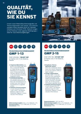 PIN-MATERIALFEUCHTEMESSGER%u00c4TGMP 2-15PIN-MATERIALFEUCHTEMESSGER%u00c4TGMP 1-130 601 078 100 / 217.00* CHFim Karton mit 2%u2009%u00d7%u2009AA-Alkaline, Tasche 0 601 078 000 / 195.00* CHF im Karton mit 2%u2009%u00d7%u2009AA-Alkaline, Tasche %u25fe Eingebauter ThermoHygrometer Sensor: durch den zus%u00e4tzlichen Sensor lassen sich sowohl Temperatur als auch die relative Luftfeuchtigkeit anzeigen%u25fe Anzeige & Materialliste:wie beim GMP 1-13 ist das Ger%u00e4t mit einer anpassbaren Schwellenwertskala ausgestattet und verf%u00fcgt %u00fcber eine Liste f%u00fcr Favoriten und Materialien, die auf dem grossen LCD-Display angezeigt werden%u25fe Zweifache Stromversorgung: Li-Ionen Akkupack BA 3.7V 1.0Ah A oder 2%u2009%u00d7%u2009AA-Alkaline Batterien sorgen f%u00fcr mehr Flexibilit%u00e4t, integriert in einem robusten IP%u200665 Geh%u00e4use%u25fe Integrierte Materialliste: das grosse LCD-Display zeigt stets das zu messende Material an. Dabei k%u00f6nnen aus einer Bibliothek von 37 Holzarten sowie 10 Baumaterialien die Favoriten definiert und diese in 36 verschiedenen Sprachen dargestellt werden%u25fe Schwellenwertanzeige:die Farbskala f%u00e4rbt nicht nur die aktuellen Messwerte auf Basis des Schwellenwerts ein, sondern kann auch direkt im Hauptbildschirm eingestellt werden%u25fe Zweifache Stromversorgung: Li-Ionen Akkupack BA 3.7V 1.0Ah A oder 2%u2009%u00d7%u2009AA-Alkaline Batterien sorgen f%u00fcr mehr Flexibilit%u00e4t, integriert in einem robusten IP%u200665 Geh%u00e4useTemperaturbereich: %u201320%u2009%u00b0C bis 50%u2009%u00b0CWiderstandsgenauigkeit: Holz: %u00b1%u20091%u2009%, Geb%u00e4ude: %u00b1%u20091%u2009%Stromversorgung: 2%u2009%u00d7%u20091,5 V LR06 (AA), 3,7 V Li-IonSchutzklasse: IP%u200665Widerstandsgenauigkeit: Holz: %u00b1%u20091%u2009%, Geb%u00e4ude: %u00b1%u20091%u2009%Stromversorgung: 2%u2009%u00d7%u20091,5 V LR06 (AA), 3,7 V Li-IonSchutzklasse: IP%u200665QUALIT%u00c4T, WIE DU SIE KENNST Unsere neuen Materialfeuchtemessger%u00e4te und Thermo-Hygrometer sind wasser- und schmutzresistent sowie stossfest durch ihr robustes Geh%u00e4use und Schutzart IP%u200665. Dadurch sorgen sie f%u00fcr Pr%u00e4zision unter jeglichen Bedingungen %u2013 ideal f%u00fcr raue Arbeitsumgebungen.NEU! NEU!10