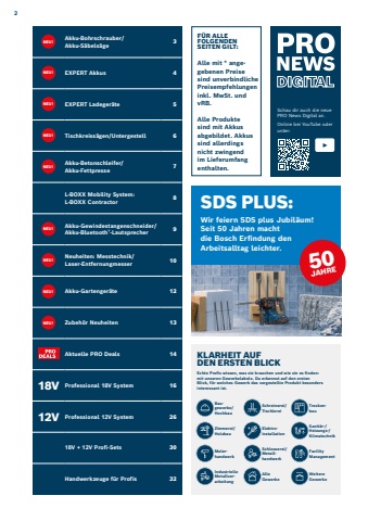 Schau dir auch die neue PRO News Digital an. Online bei YouTube oder unter: NEU! Akku-Bohrschrauber/ Akku-S%u00e4bels%u00e4ge 3NEU! EXPERT Akkus 4NEU! EXPERT Ladeger%u00e4te 5NEU! Tischkreiss%u00e4gen/Untergestell 6NEU! Akku-Betonschleifer/ Akku-Fettpresse 7L-BOXX Mobility System: L-BOXX Contractor 8NEU! Akku-Gewindestangenschneider/ Akku-Bluetooth%u00ae-Lautsprecher 9NEU! Neuheiten: Messtechnik/ Laser-Entfernungmesser 10NEU! Akku-Gartenger%u00e4te 12NEU! Zubeh%u00f6r Neuheiten 13Aktuelle PRO Deals 1418V Professional 18V System 1612V Professional 12V System 2618V + 12V Profi-Sets 30Handwerkzeuge f%u00fcr Profis 32Echte Profis wissen, was sie brauchen und wie sie es finden: mit unseren Gewerkelabels. Du erkennst auf den ersten Blick, f%u00fcr welches Gewerk das vorgestellte Produkt besonders interessant ist.KLARHEIT AUF DEN ERSTEN BLICKBaugewerbe/HochbauSchreinerei/TischlereiTrockenbauZimmerei/HolzbauElektroinstallationSanit%u00e4r-/ Heizungs-/KlimatechnikMalerhandwerkSchlosserei/MetallhandwerkFacilityManagementIndustrielle MetallverarbeitungAlleGewerkeWeitereGewerkeWir feiern SDS plus Jubil%u00e4um!Seit 50 Jahren macht die Bosch Erfindung den Arbeitsalltag leichter.SDS PLUS:F%u00dcR ALLE FOLGENDEN SEITEN GILT:Alle mit * angegebenen Preise sind unverbindliche Preisempfehlungen inkl. MwSt. und vRB.Alle Produkte sind mit Akkus abgebildet. Akkus sind allerdings nicht zwingend im Lieferumfang enthalten.50 JAHRE2