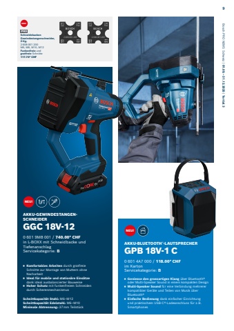 AKKU-GEWINDESTANGENSCHNEIDERGGC 18V-120%u2005601%u20059M8%u2005001 / 740.00* CHF in L-BOXX mit Schneidbacke und Tiefenanschlag Servicekategorie: BSchnittkapazit%u00e4t Stahl: M6%u2013M12Schnittkapazit%u00e4t Edelstahl: M6%u2013M10Minimale Abtrennung: 37%u2009mm Teilst%u00fcckAKKU-BLUETOOTH%u00ae-LAUTSPRECHER GPB 18V-1 C0%u2005601%u20054A7%u2005000 / 118.00* CHFim KartonServicekategorie: B%u25fe Geniesse den grossartigen Klang %u00fcber Bluetooth%u00ae oder Multi-Speaker Sound in einem kompakten Design%u25fe Multi-Speaker Sound f%u00fcr eine Verbindung mehrerer kompatibler Ger%u00e4te und Teilen von Musik %u00fcber Bluetooth%u00ae%u25fe Einfache Bedienung dank einfacher Einrichtung und praktischem USB-C%u00ae-Ladeanschluss f%u00fcr z.%u2009B. Smartphones %u25fe Komfortables Arbeiten durch gratfreie Schnitte zur Montage von Muttern ohne Nacharbeit%u25fe Ideal f%u00fcr mobile und station%u00e4re Eins%u00e4tze dank ideal ausbalancierter Bauweise%u25fe Hoher Schutz mit funkenfreiem Schneiden durch ScherenmechanismusSchneidebacken Gewindestangen schneider, 2-tlg. 2 608 001 200M6, M8, M10, M12Funkenfreie und gratfreie Schnitte117.70* CHFNEU!NEU!NEU! Bosch PRO NEWS Schweiz | 01.09.%u2009%u2013%u200931.12.2025 | Tertial 39