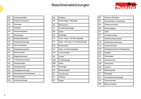 6Maschinenabk%u00fcrzungen HOMEBO ExzenterschleiferCA Fr%u00e4se f%u00fcr AlucobondCC SchneiderCF VentilatorCG KartuschenpistoleCL StaubsaugerCO RotationsschneiderCS Metallhandkreiss%u00e4geCU Akku-SchubkarreDA WinkelbohrmaschineDF BohrschrauberFR MagazinschrauberFS TrockenbauschrauberGA WinkelschleiferGS GeradeschleiferHP SchalgbohrschrauberHR Bohrhammer/ KombihammerHS Handkreiss%u00e4geHW HochdruckreinigerJN KnabberJR Recipros%u00e4ge / S%u00e4bels%u00e4geJS BlechschereJV Pendelhubstichs%u00e4geKP HobelLB Bands%u00e4geLF Tisch-, Kapp- und Gehrungss%u00e4geLH Kapp-. Gehrungs- und Tischkreiss%u00e4geLM Rasenm%u00e4herLS Kapp- und Gehrungss%u00e4geLW TrennschleiferML LampeMLT Tischkreiss%u00e4geMR RadioPB Bands%u00e4gePC BetonschleiferPF TauchpumpePJ Nutfr%u00e4sePT NaglerRP Eintauch-Oberfr%u00e4seRT Einhandfr%u00e4se / Kantenfr%u00e4seSA RotationsschleiferSG Mauernutfr%u00e4seST TakerTD SchlagschrauberTL WinkelschlagschrauberTM MultifunktionswerkzeugTS ImpulsschrauberTW Schlagschrauber f%u00fcr Schlagn%u00fcsseUB Gebl%u00e4seUC Kettens%u00e4geUH HeckenschereUM GrasschereUR TrimmerUS R%u00fcckenspritzeUT R%u00fchrger%u00e4tVC Industrieller StaubsaugerVP VakuumpumpeVR Betonverdichter