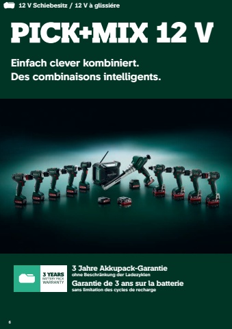 6Einfach clever kombiniert.Des combinaisons intelligents.12 V Schiebesitz / 12 V %u00e0 glissi%u00e9re12 V3 Jahre Akkupack-Garantieohne Beschr%u00e4nkung der LadezyklenGarantie de 3 ans sur la batteriesans limitation des cycles de recharge