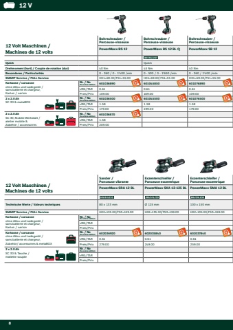 2x812 Volt Maschinen / Machines de 12 voltsBohrschrauber / Perceuse-visseuseBohrschrauber / Perceuse-visseuseBohrschrauber / Perceuse-visseusePowerMaxx BS 12PowerMaxx BS 12 BL QPowerMaxx SB 12QuickQuickDrehmoment (hart) / Couple de rotation (dur)40 Nm45 Nm40 NmBesonderes / Particularit%u00e9s0 - 360 / 0 - 1'400 /min0 - 500 / 0 - 1'650 /min0 - 360 / 1'400 /minSMART Service / FULL ServiceH01=69.00/FS1=55.00H01=69.00/FS1=55.00H01=69.00/FS1=55.00Karkasse / carcasseohne Akku und Ladeger%u00e4t / sans batterie et chargeur,Karton / cartonNr. / No the swiss edition601036890601045850601076890vRG/TAR0.610.610.61Preis/Prix109.00169.00109.002 x 2.0 Ah SC 30 & metaBOXNr. / No the swiss edition601036500601045500601076500vRG/TAR1.581.581.58Preis/Prix179.00239.00179.002 x 2.0 AhSC 30, Mobile Werkstatt / atelier mobile & Zubeh%u00f6r / accessoiresNr. / No the swiss edition601036870vRG/TAR1.58Preis/Prix209.0012 Volt Maschinen / Machines de 12 voltsSander / Ponceuse vibranteExzenterschleifer / Ponceuse excentriqueExzenterschleifer / Ponceuse excentriquePowerMaxx SRA 12 BLPowerMaxx SXA 12-125 BLPowerMaxx SMA 12 BLTechnische Werte / Valeurs techniques80 x 133 mm%u00d8 125 mm100 x 150 mmSMART Service / FULL ServiceH02=135.00/FS3=159.00H02=135.00/FS3=159.00H02=135.00/FS3=159.00Karkasse / carcasseohne Akku und Ladeger%u00e4t / sans batterie et chargeur,Karton / cartonNr. / No the swiss editionvRG/TARPreis/PrixKarkasse / carcasseohne Akku und Ladeger%u00e4t / sans batterie et chargeur,Zubeh%u00f6r/ accessoires & metaBOXNr. / No the swiss edition602036920602035840602037840vRG/TAR0.610.610.61Preis/Prix279.00249.00259.002 x 2.0 Ah SC 30 & Tasche / mallette soupleNr. / No the swiss editionvRG/TARPreis/Prix12 V2x2x