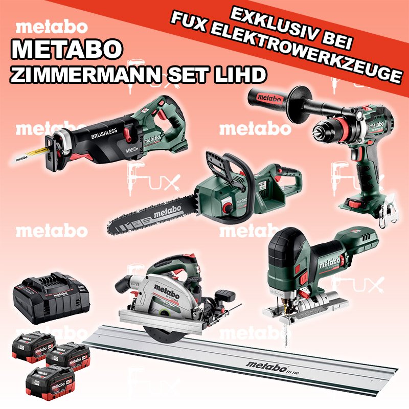 Das Ladenlokal bleibt vom 25. Dezember 2025 bis am 04. Januar 2026 geschlossen. Bestellungen und Lieferungen von Neugeräten werden trotz Ferienabwesenheit in gewohnter Fux-Manier entgegengenommen und ausgeliefert. Heute auf dieses Produkt 27% Rabatt! Zu "Zimmermann Set" von Metabo FULL Service: 36 Monate zum Nulltarif für Sie! Weitere Infos zum FULL Service Dieses Produkt ist CAS kompatibel! Weitere Infos zu CAS Sparfux Aktionen FUX SPECIAL EXKLUSIV BEI FUX Metabo Zimmermann SET 16 LiHD Bestell- und Artikelnummer: Zimmermann SET 16 LiHD BS 18 LTX BL Q I Akku-BohrschrauberAkkuspannung 18 V Drehzahl 0-550 / 0-2000 U/min Drehmoment hart / weich 130 / 65 Nm Gewicht (mit Akkupack) 2.3 kgInfos MS 36-18 LTX BL 40 Akku KettensägeAkkuspannung 18 V Schnittlänge 36 cm Max. Kettengeschwindigkeit 22 m/s Gewicht mit Akkupack 4,6 kgInfos SSEP 18 LTX BL MVT Akku-SäbelsägeAkkuspannung 18 V Hubzahl bei Leerlauf 0 - 3.000 /min Gewicht (mit Akkupack) 4.6 kgInfos STA 18 LTX 150 BL Akku-StichsägeAkkuspannung 18 V Hubzahl 1.000-3.500 /min Gewicht ohne Akkupack 1.9 kgInfos KS 18 LTX 66 BL Akku HandkreissägeAkkuspannung 18 V Schnitt-Tiefe bei 90° 0-66 mm Sägeblatt 165 mm Gewicht 4.5 kgInfos FS 160 FührungsschieneGesamtlänge 1600 mmInfos 3 x 18 V, 5.5 Ah, LiHD Akkupack18 V 5.5 Ah ( LiHD Akkus ) Infos ASC 145, 12 - 36 V "Air Cooled" LadegerätZum Aufladen aller Li-Power Schiebesitz-Akkupacks (12 V - 36 V). Ladestrom 8.0 AInfos Registriere die in diesem Set vorhandenen Metabo Maschinen auf metabo.ch, und ergattere dir bis zu 5 Gratis Akkus!Zusätzlich offerieren wir zu diesem Set einen Gratis Akku! Standard-Ausrüstung In diesem Set enthalten: BS 18 LTX BL Q I Akku-Bohrschrauber MS 36-18 LTX BL 40 Akku Kettensäge SSEP 18 LTX BL MVT Akku-Säbelsäge STA 18 LTX 150 BL Akku-Stichsäge KS 18 LTX 66 BL Akku Handkreissäge FS 160 Führungsschiene 3 x 18 V, 5.5 Ah, LiHD Akkupack ASC 145, 12 - 36 V "Air Cooled" Ladegerät Listenpreis CHF 2'581.50 Fuxpreis CHF 1'866.00 inkl. 8.1% MwSt, inkl vRG Versand CHF 25.00 Kein Grauimport! Produkt bestellen 1 Stück 2 Stück 3 Stück 4 Stück 5 Stück 6 Stück 7 Stück 8 Stück 9 Stück 10 Stück Alle Angaben ohne Gewähr und solange Vorrat reicht!Wiederverkäufer werden? Produkt als PDF NEUHEITAKTION 27%